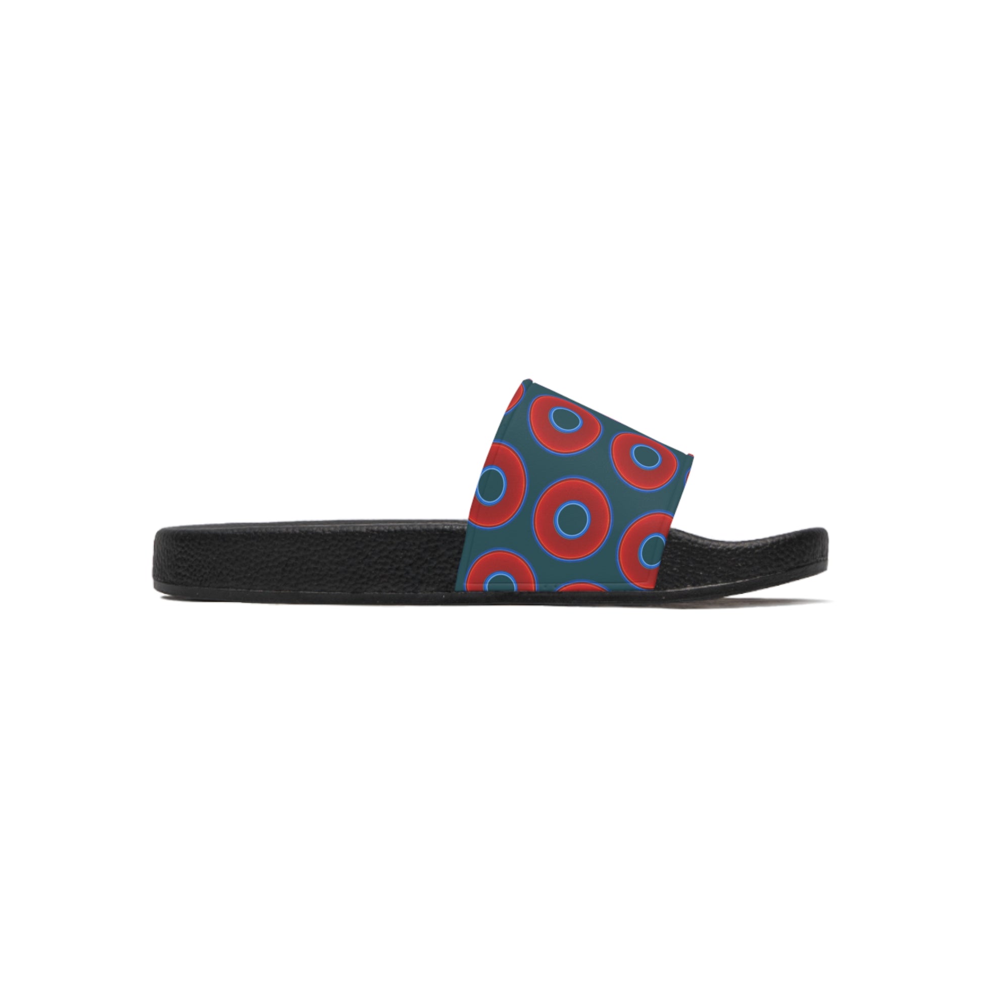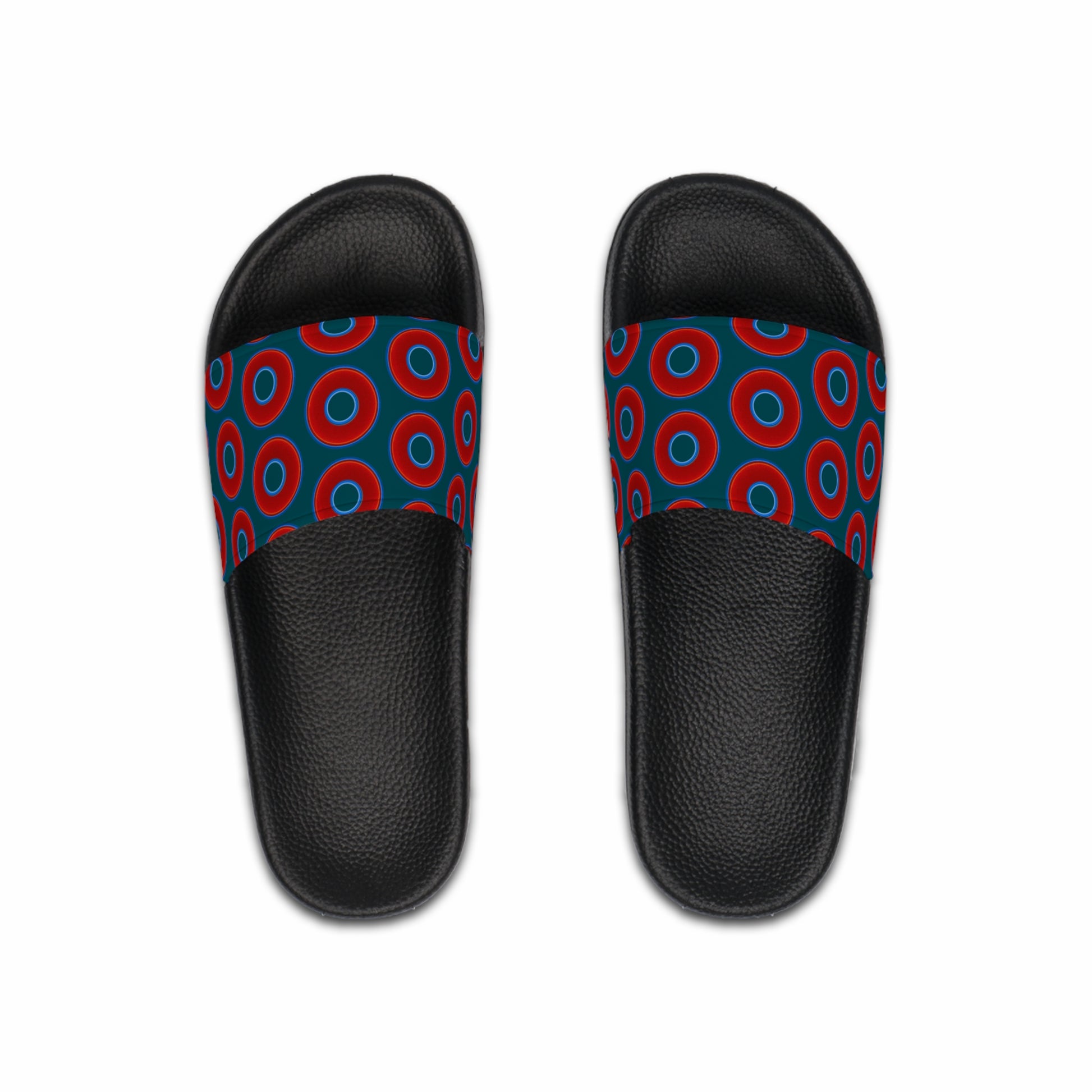 Men's Lumpy Sandals - slip-ons - red vivid donuts w/midnight teal green background