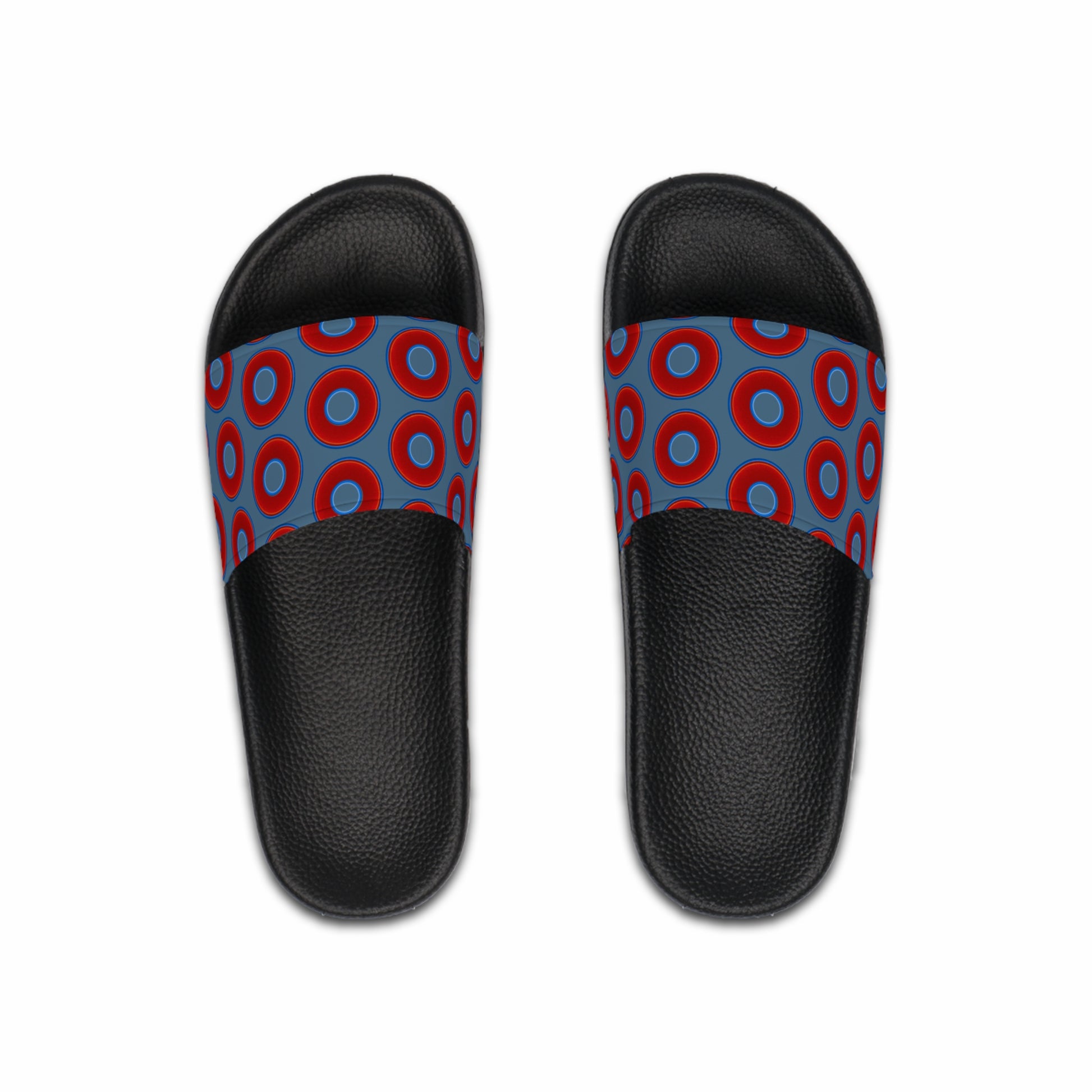 Men's Lumpy Sandals - slip-ons - red vivid donuts w/steel blue background