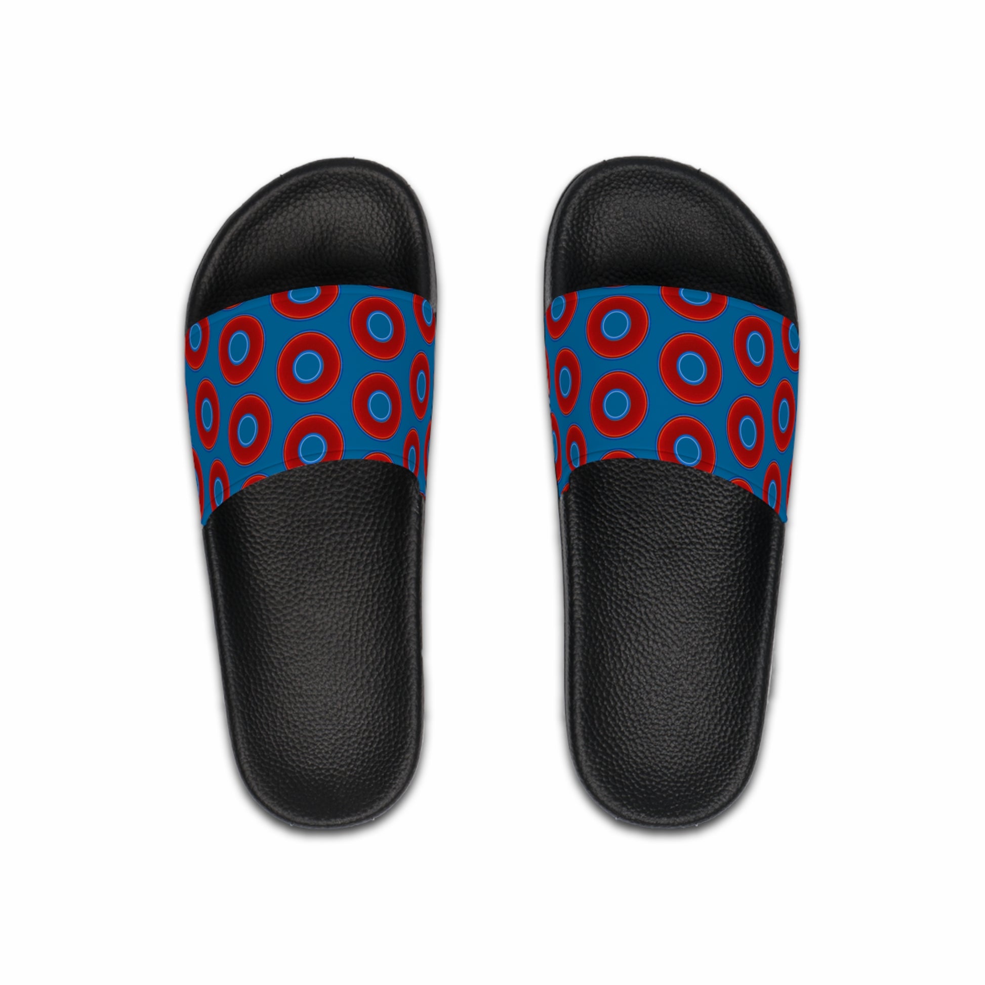 Men's Lumpy Sandals - slip-ons - red vivid donuts w/wavy navy blue background