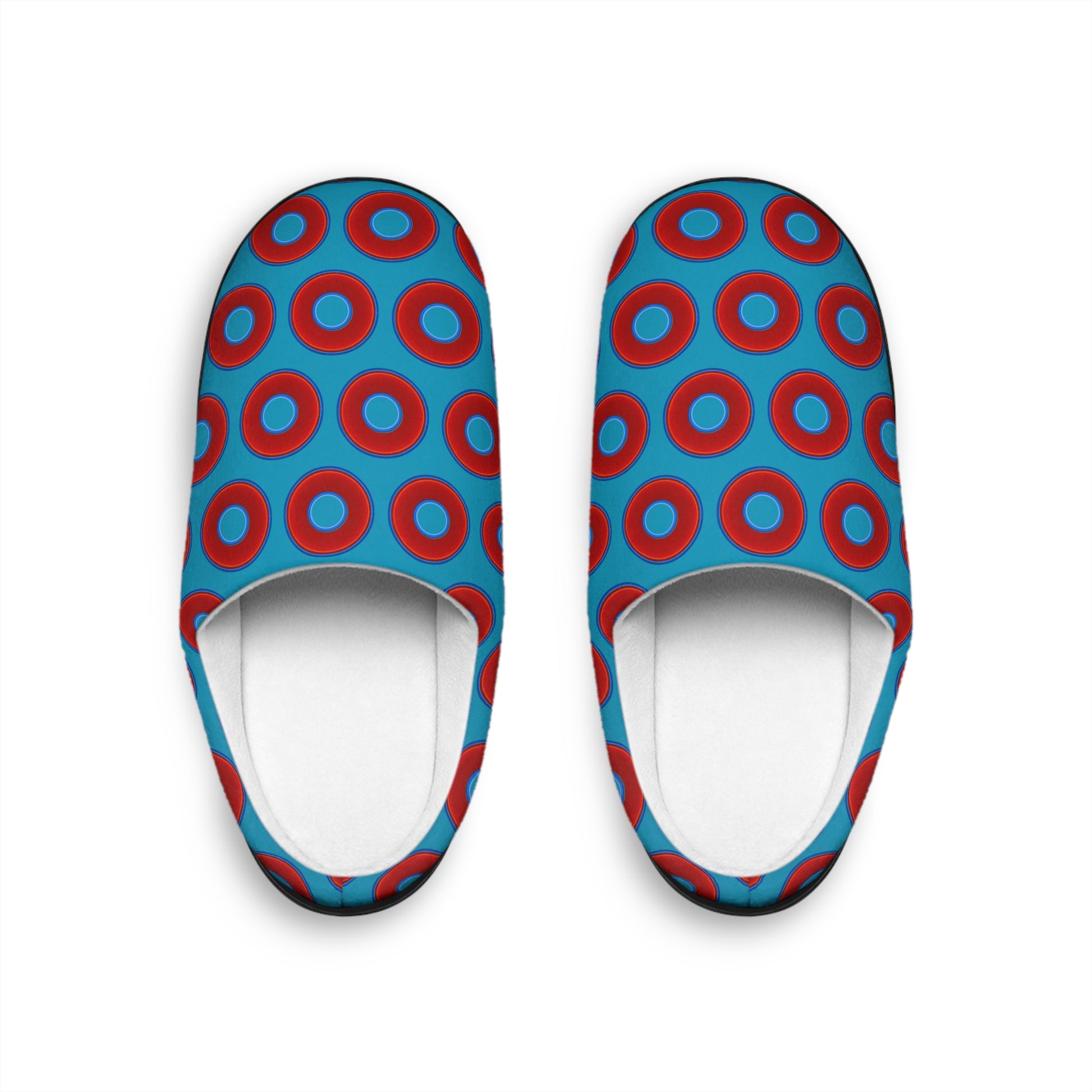 Men's Lumpy Slippers - red vivid donut print w/aquamarine blue background