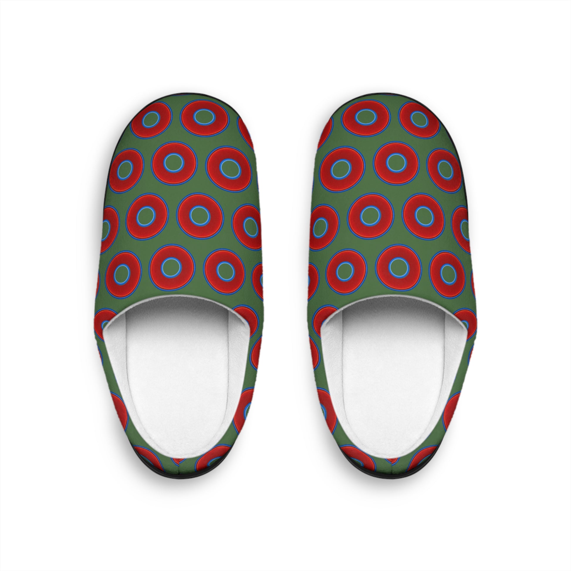 Men's Lumpy Slippers - red vivid donut print w/dark green background
