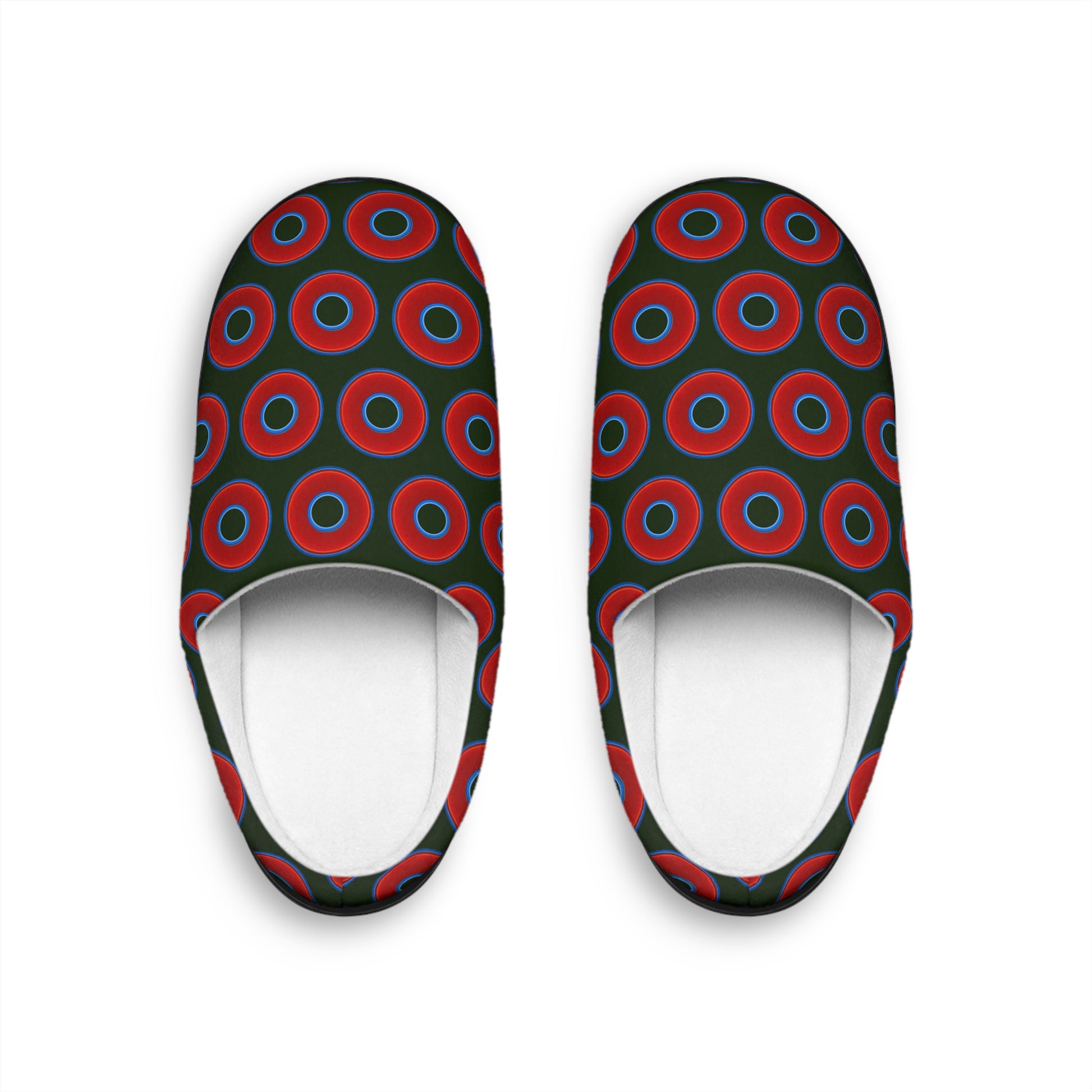 Men's Lumpy Slippers - red vivid donut print w/deep forest green background