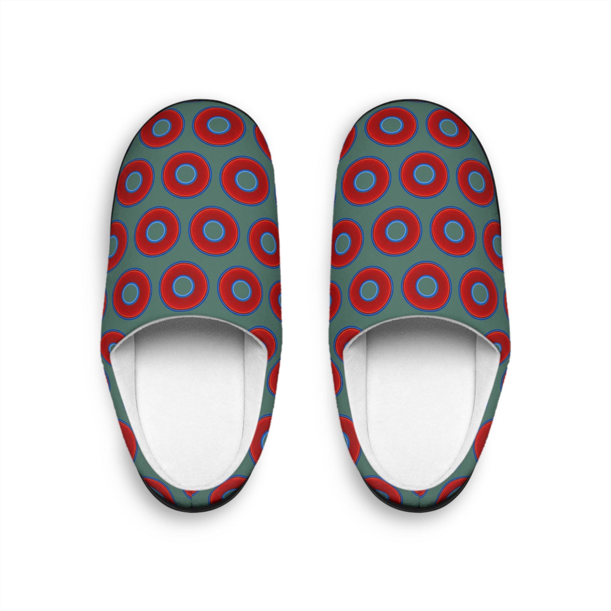 Men's Lumpy Slippers - red vivid donut print w/Fenway green background