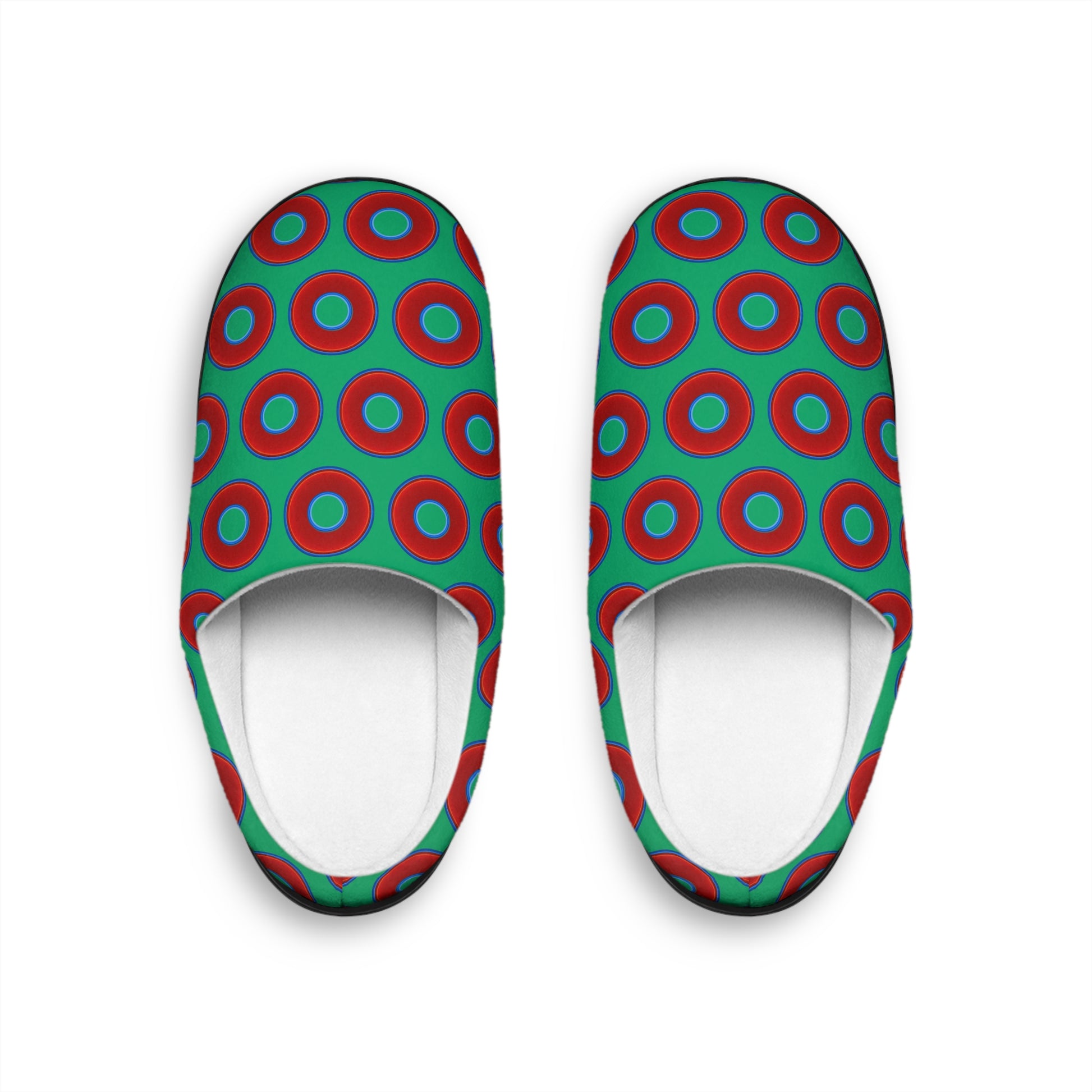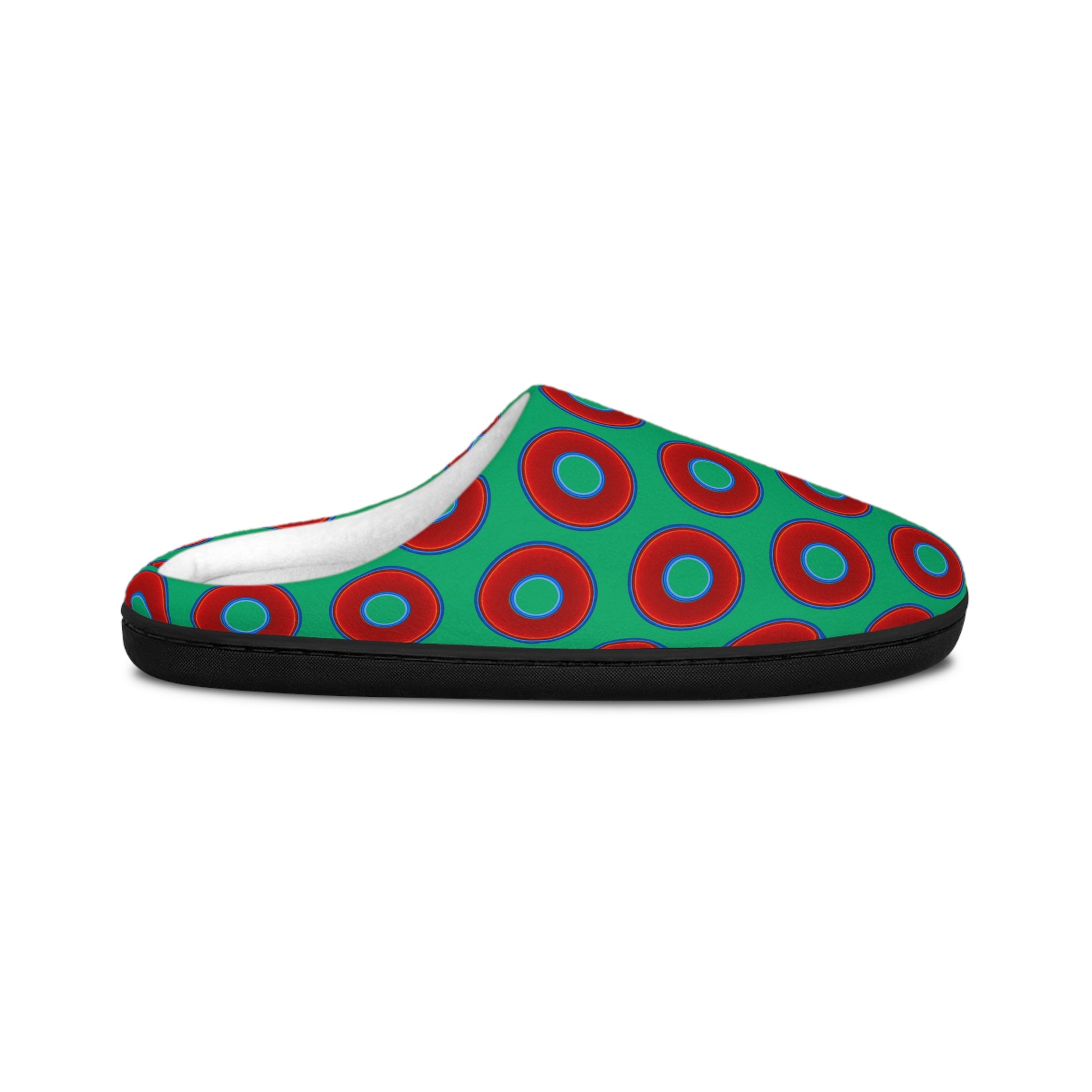 Men's Lumpy Slippers - red vivid donut print w/jade green background