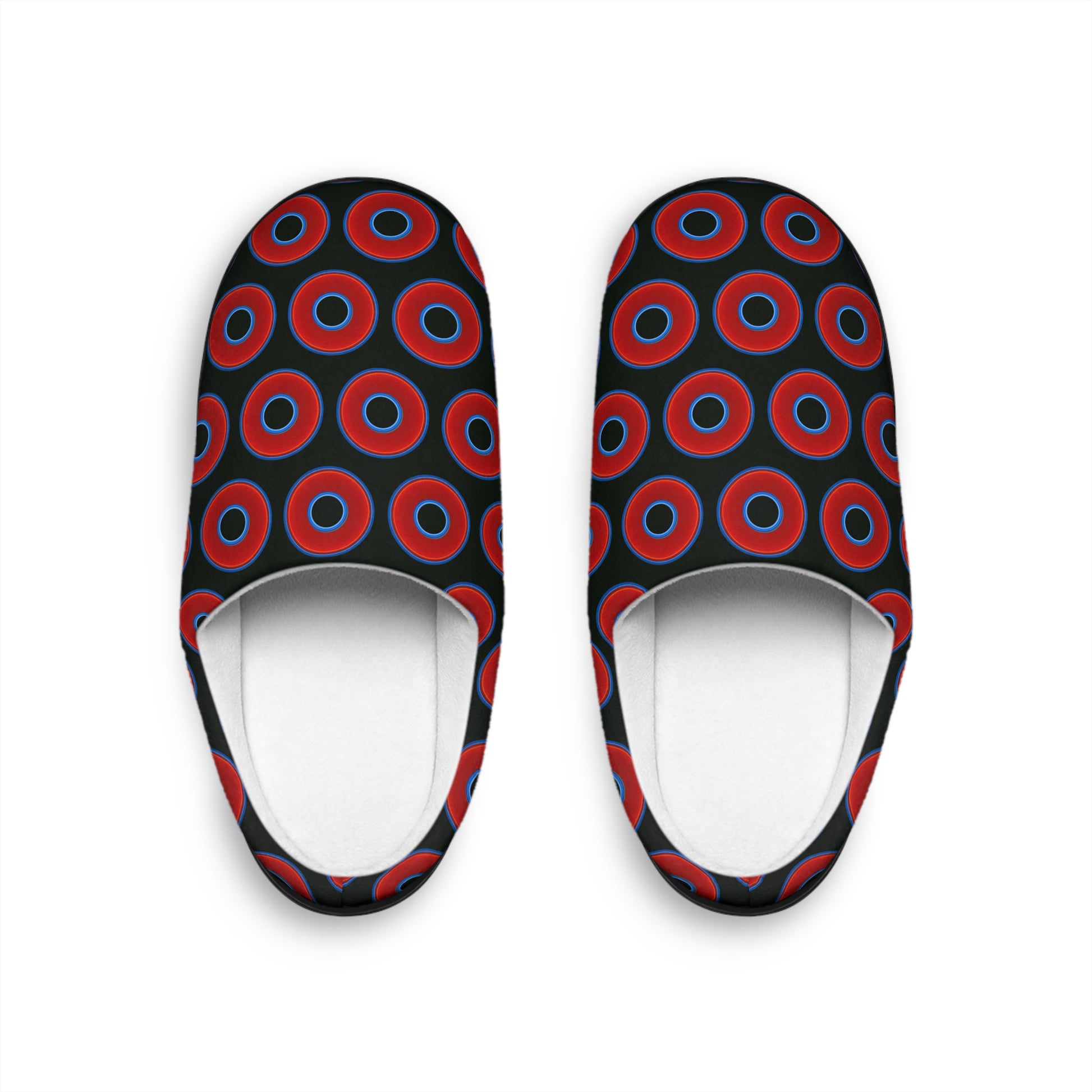 Men's Lumpy Slippers - red vivid donut print w/midnight moss green background