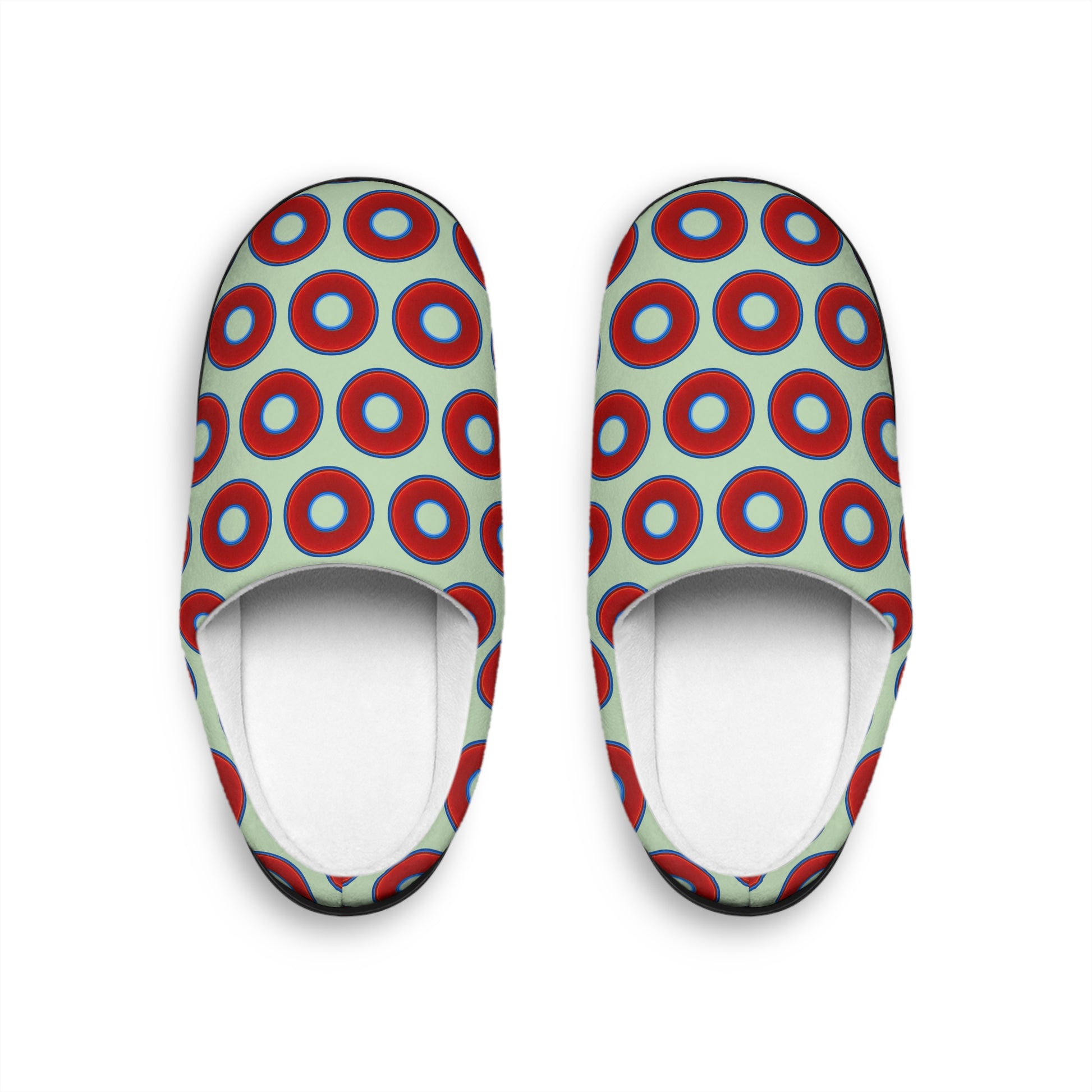 Men's Lumpy Slippers - red vivid donut print w/seafoam background