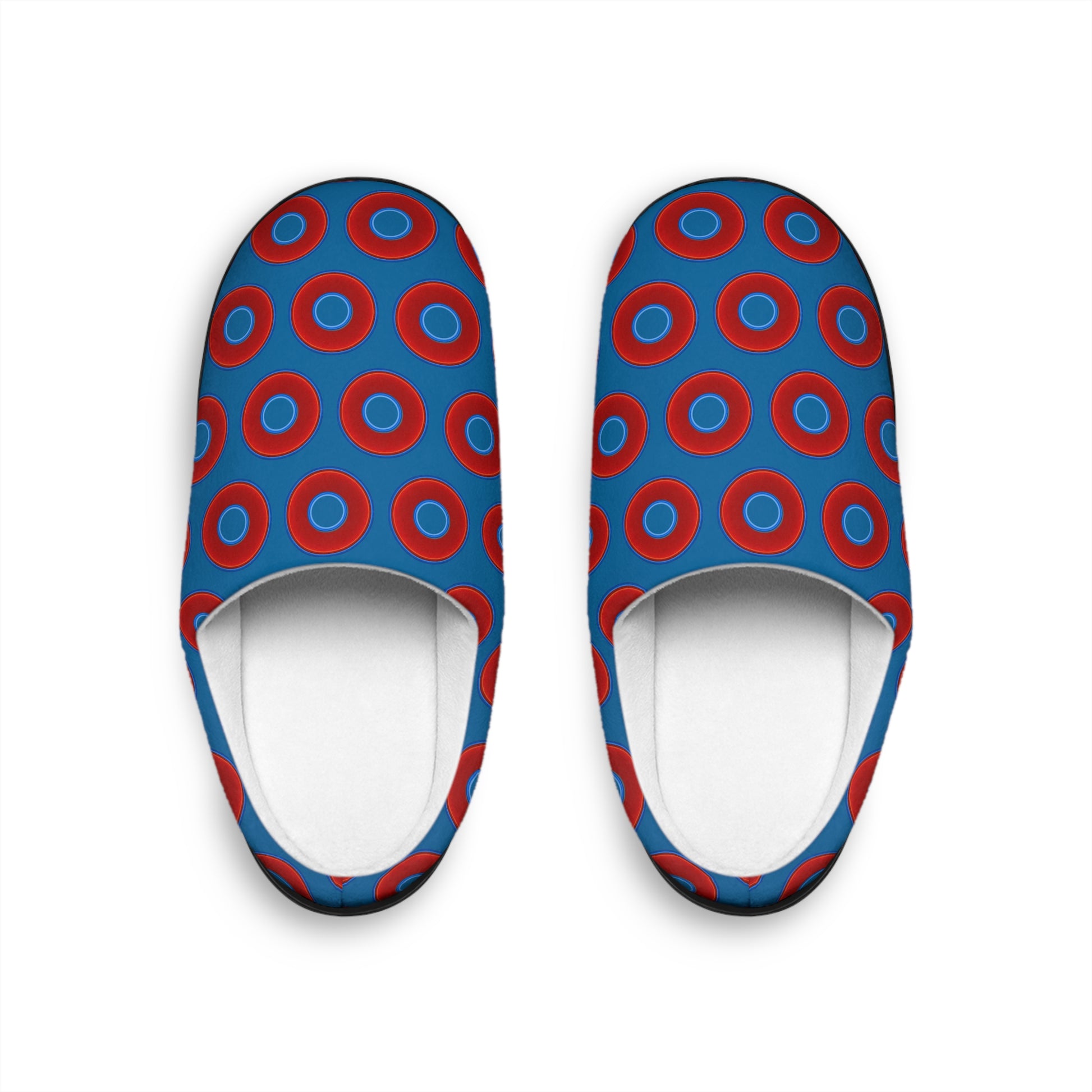 Men's Lumpy Slippers - red vivid donut print w/wavy navy blue background