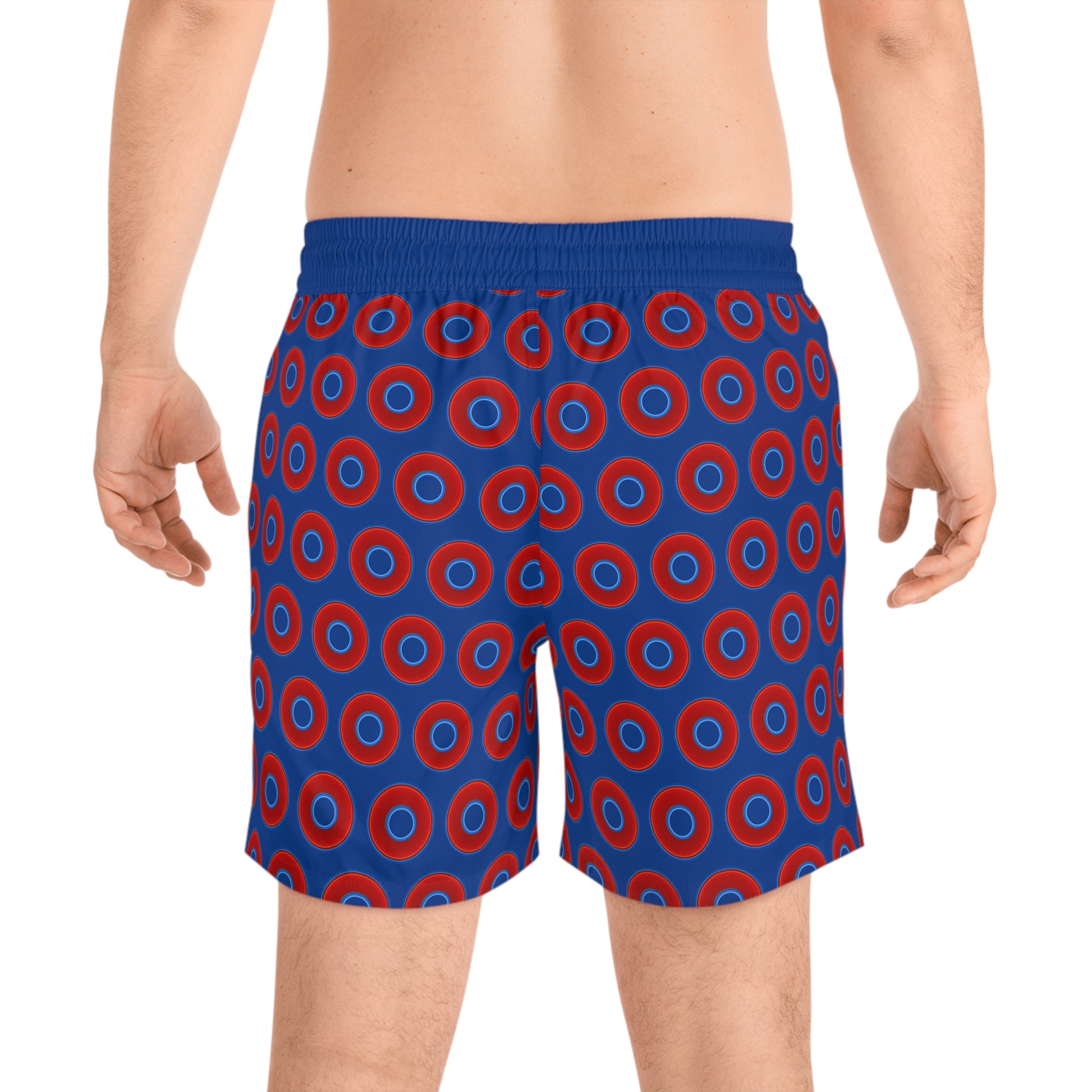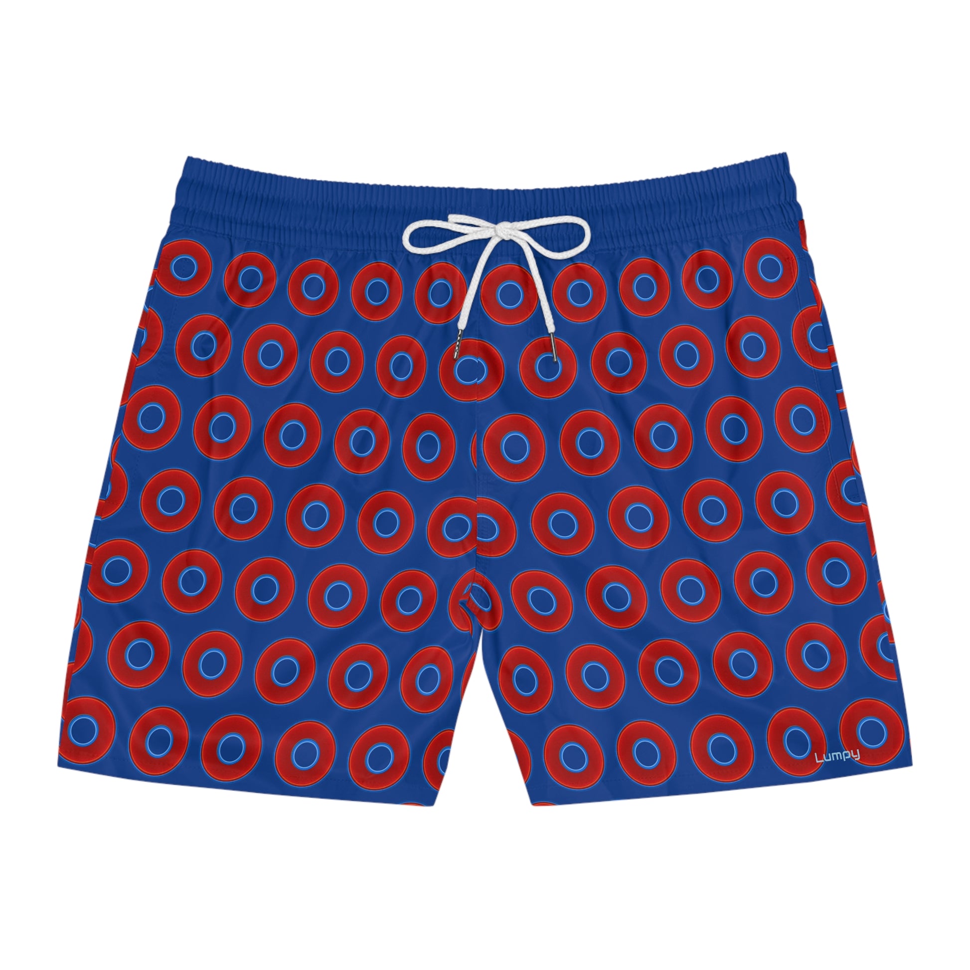 Men's Lumpy Swim Trunks - vivid red donut print w/dark blue background