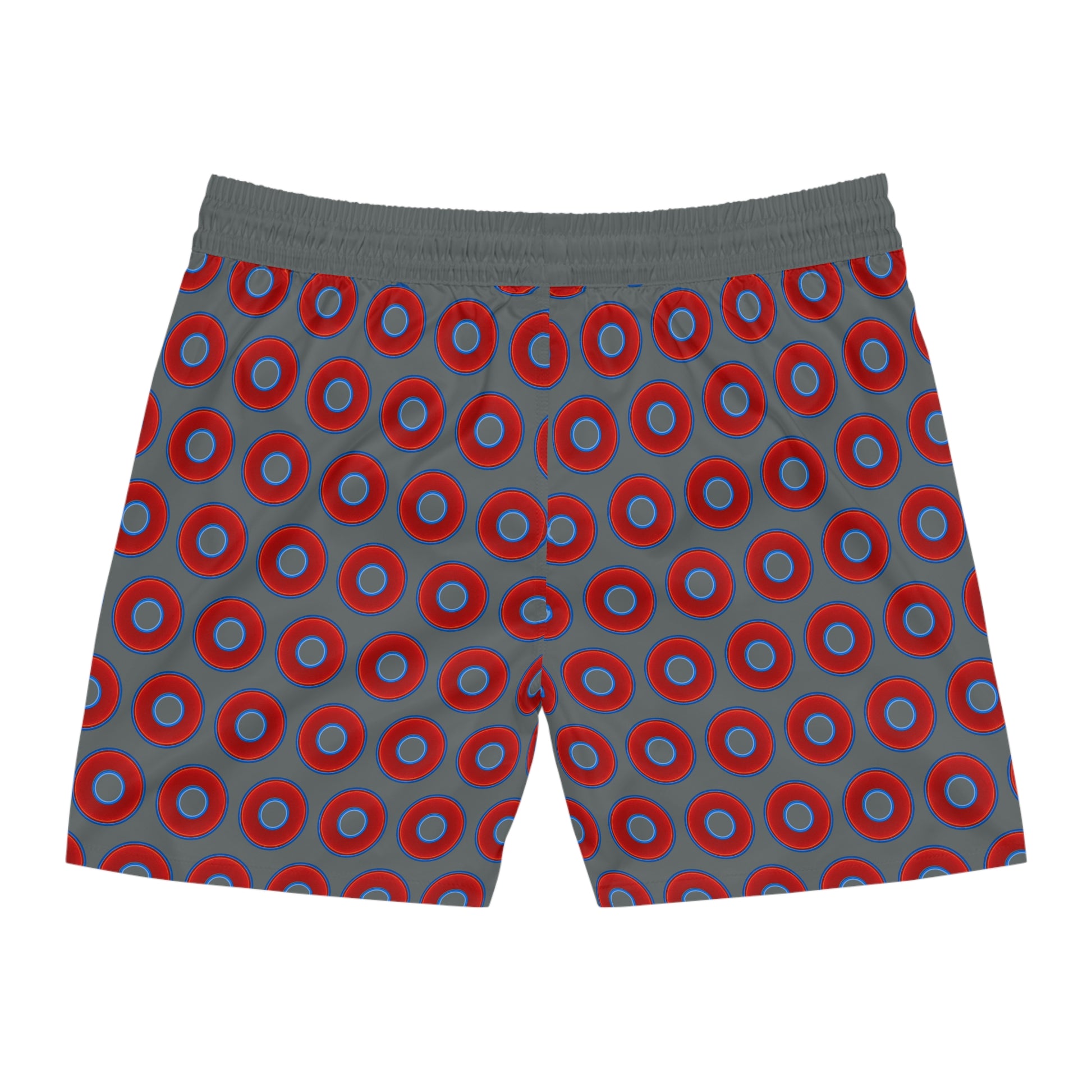 Men's Lumpy Swim Trunks - vivid red donut print w/dark gray background