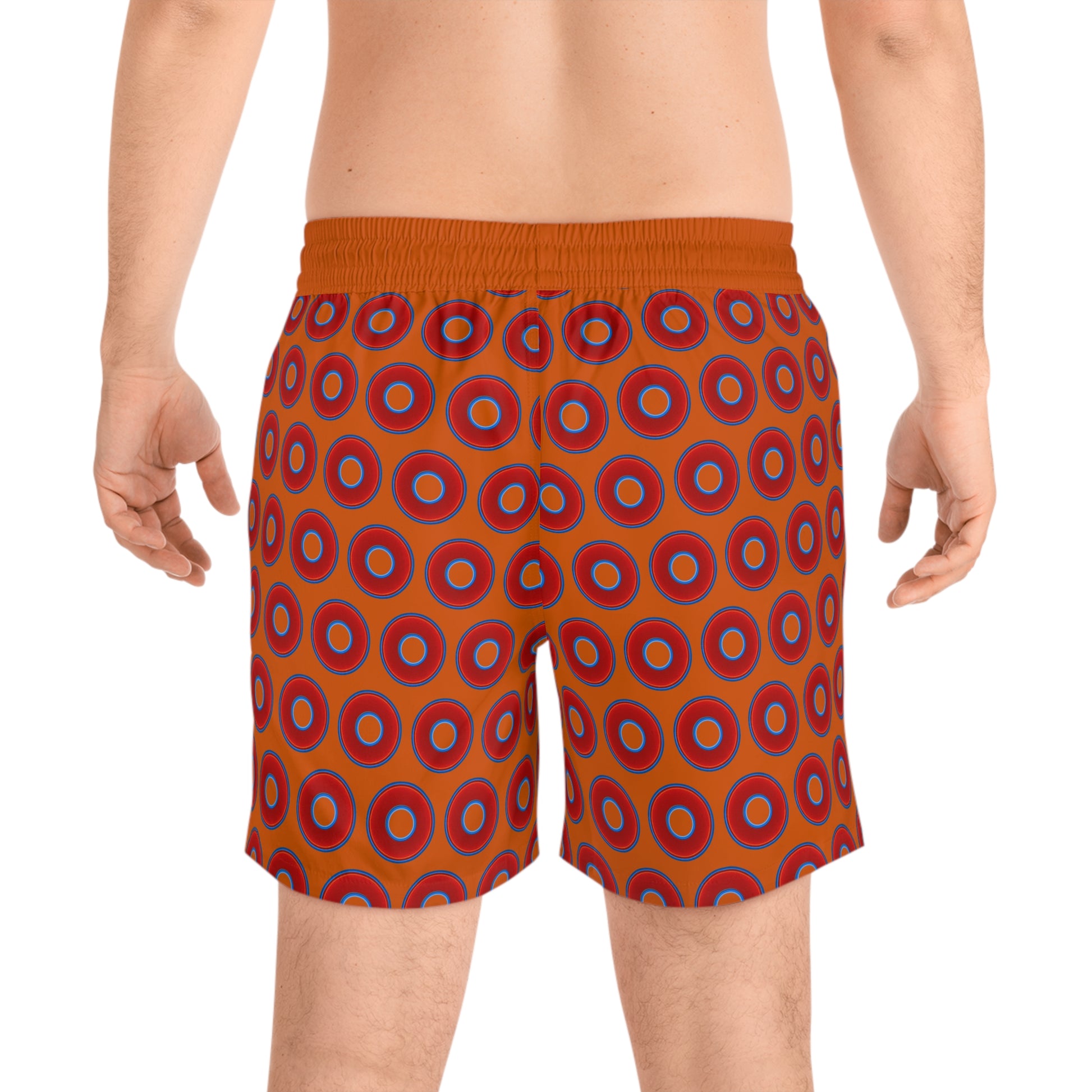Men's Lumpy Swim Trunks - vivid red donut print w/dark orange background