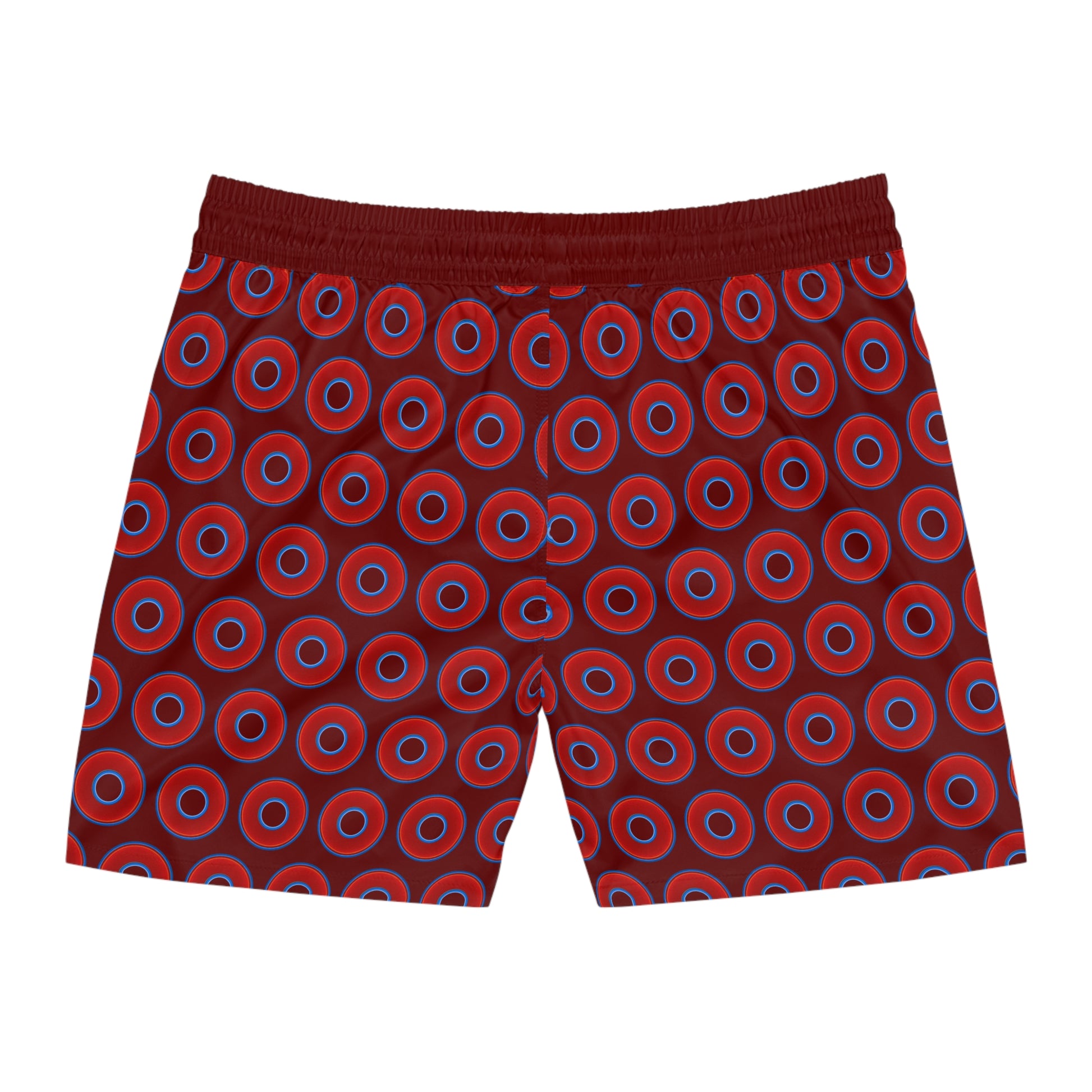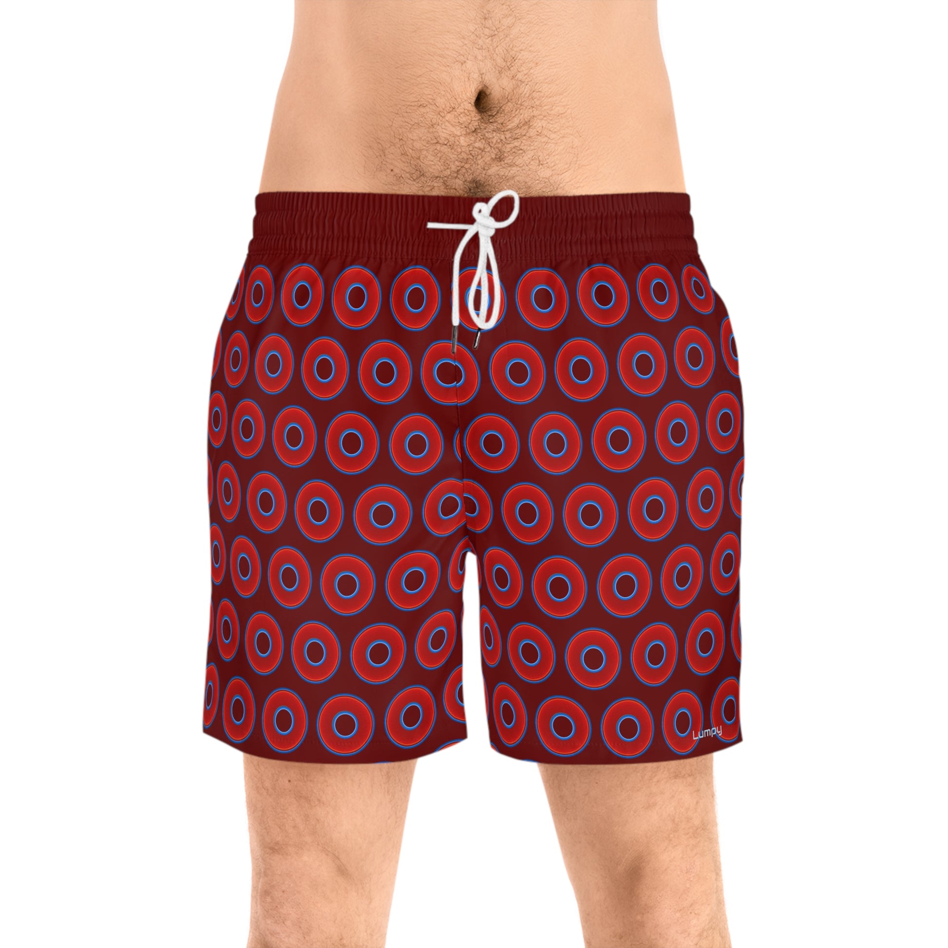 Men's Lumpy Swim Trunks - vivid red donut print w/dark red background