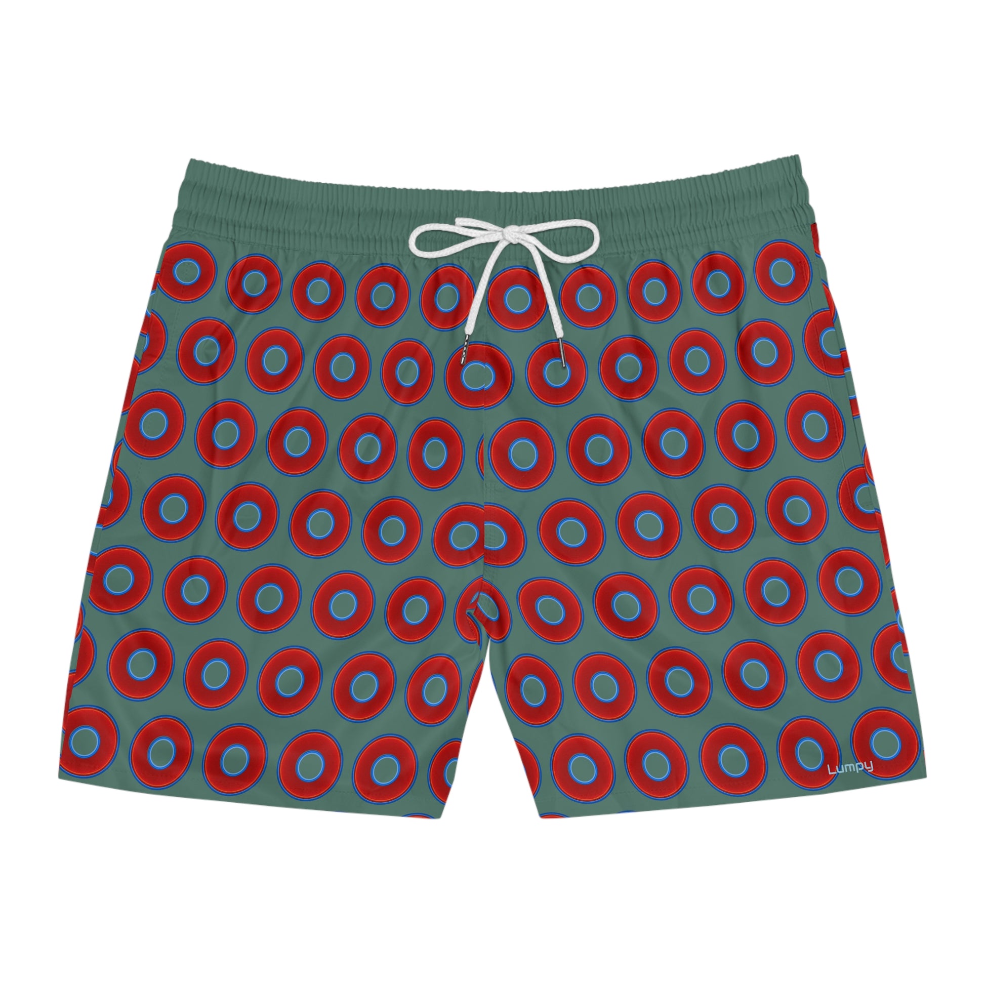 Men's Lumpy Swim Trunks - vivid red donut print w/Fenway green background