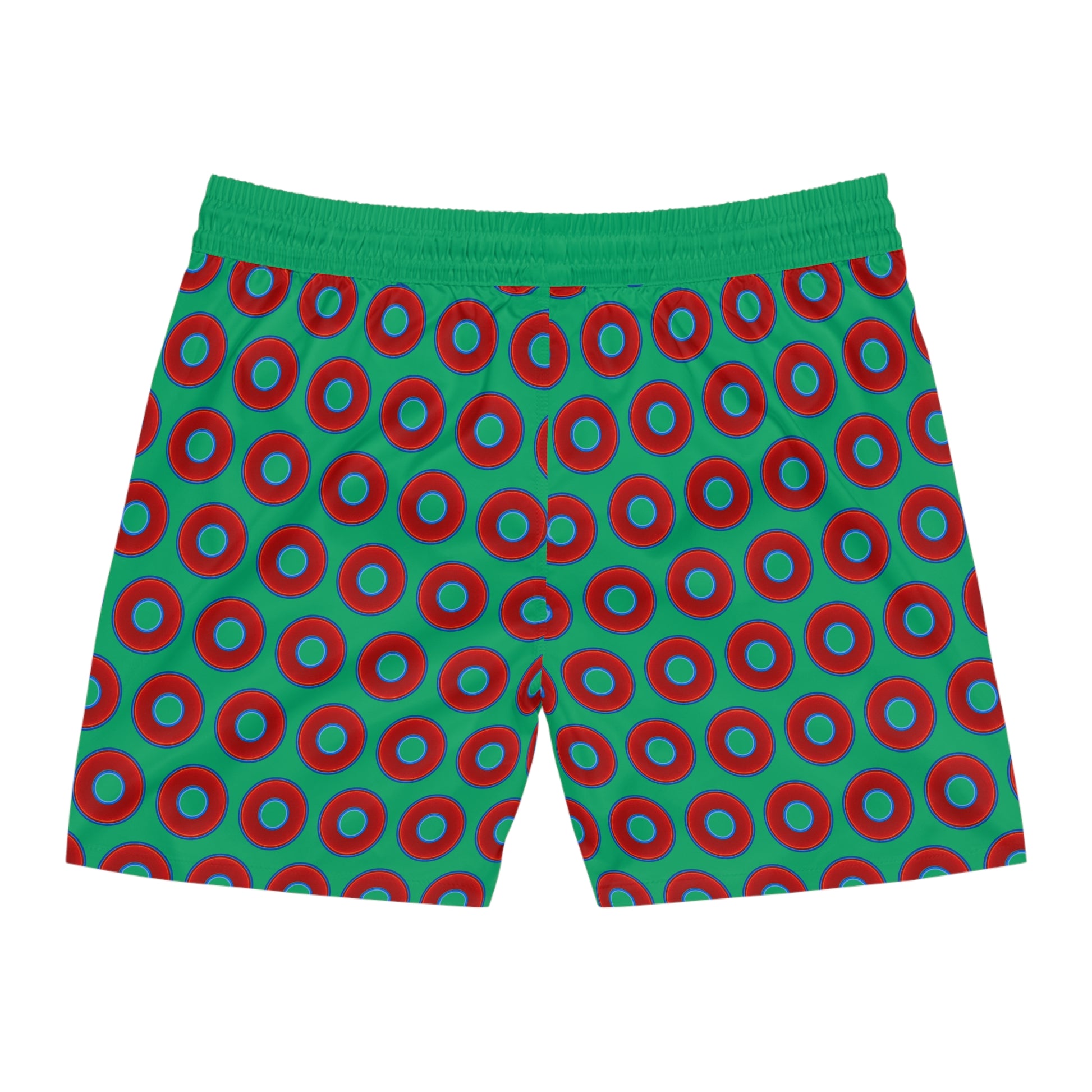 Men's Lumpy Swim Trunks - vivid red donut print w/jade green background