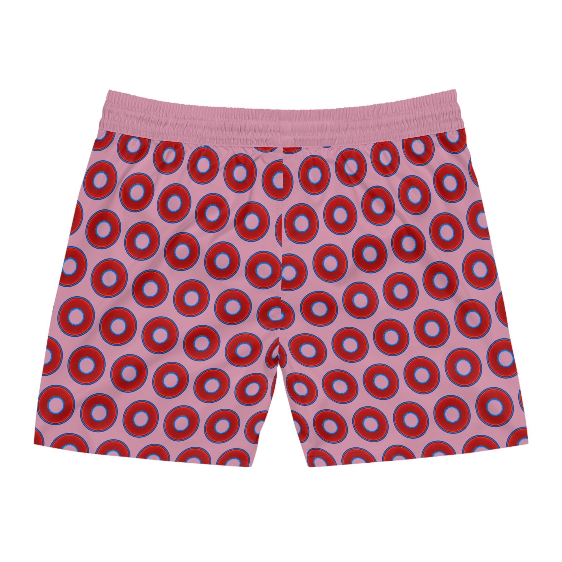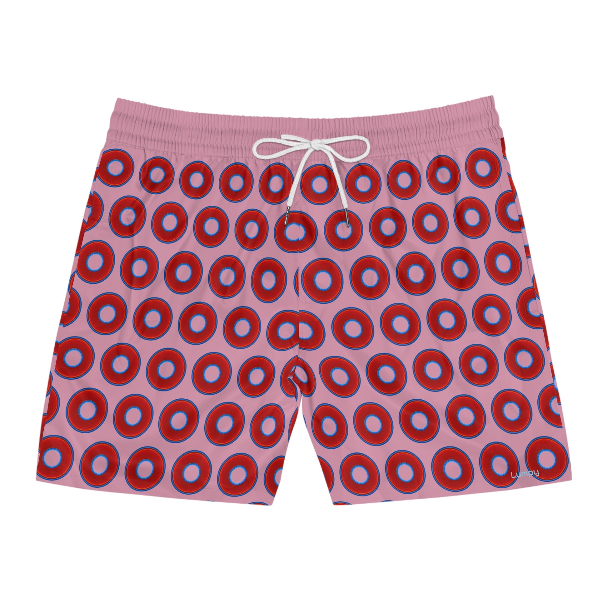 Men's Lumpy Swim Trunks - vivid red donut print w/pale magenta background
