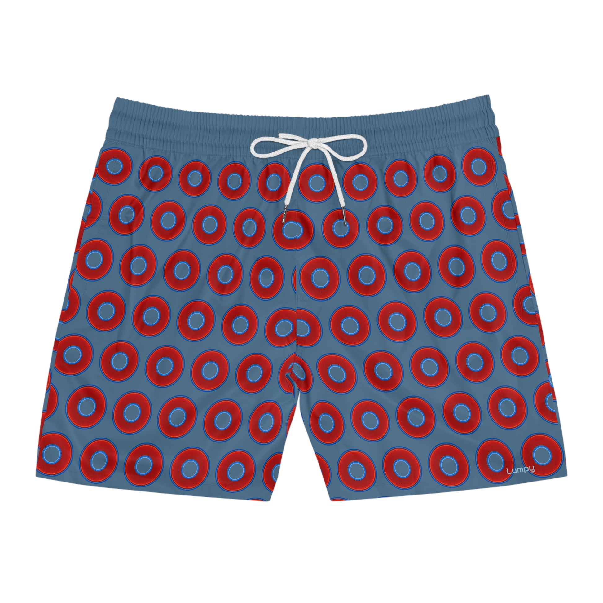 Men's Lumpy Swim Trunks - vivid red donut print w/steel blue background