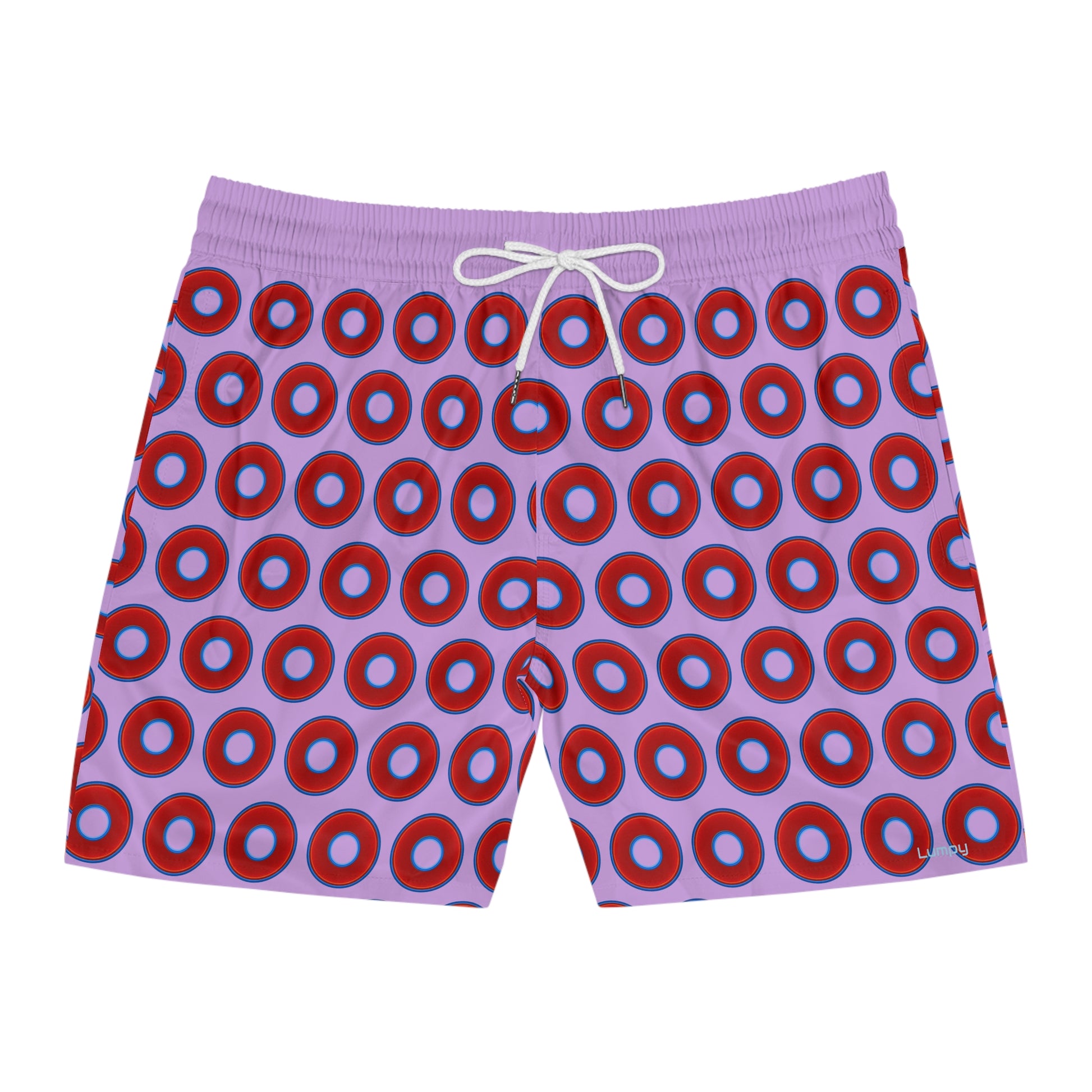 Men's Lumpy Swim Trunks - vivid red donut print w/wisteria purple background