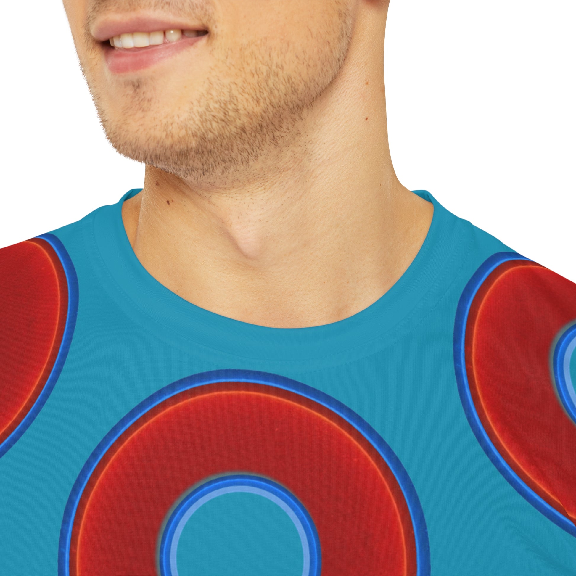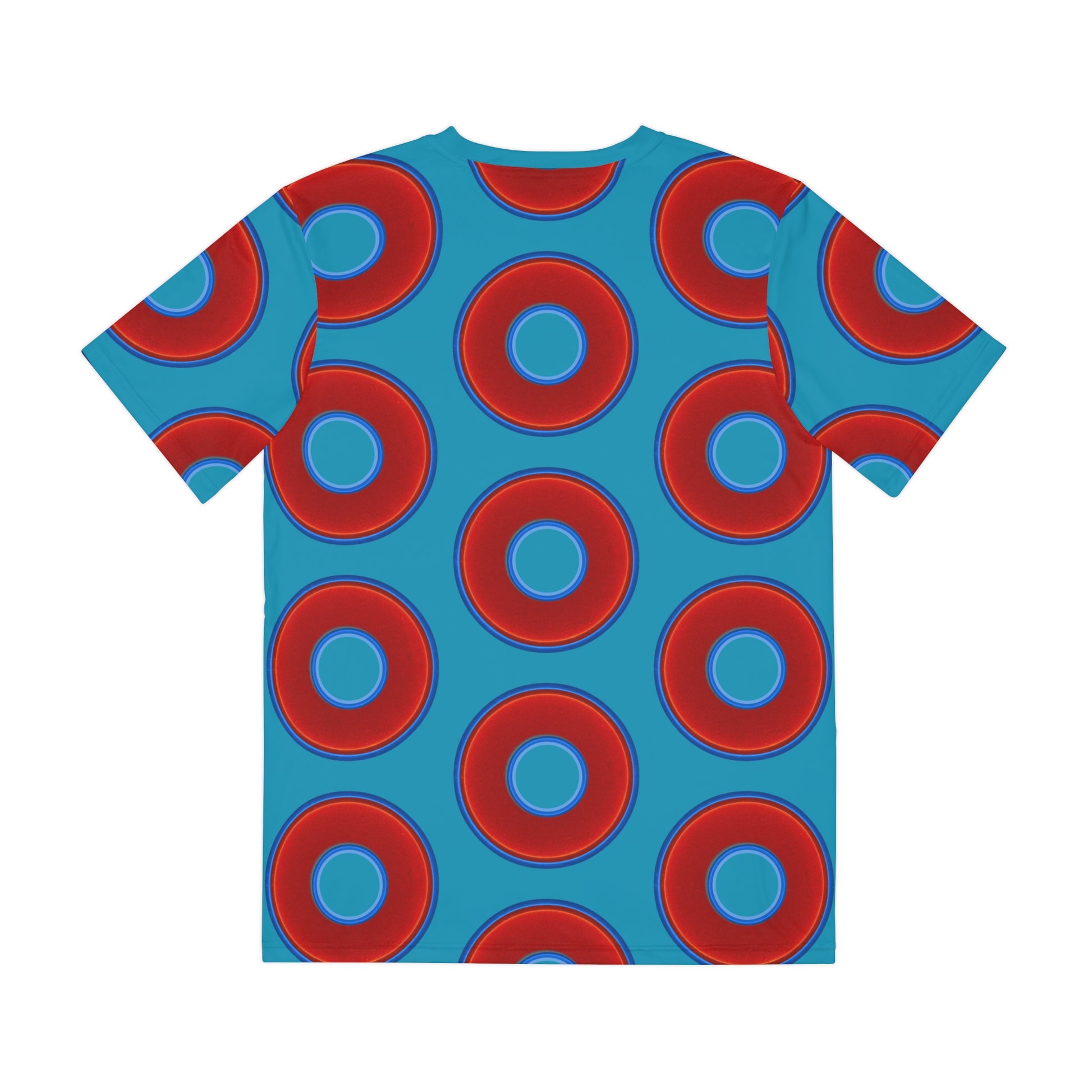 Multi-Beastie Giant Donut AOP Polyester Tee - red vivid donut print w/aquamarine blue background