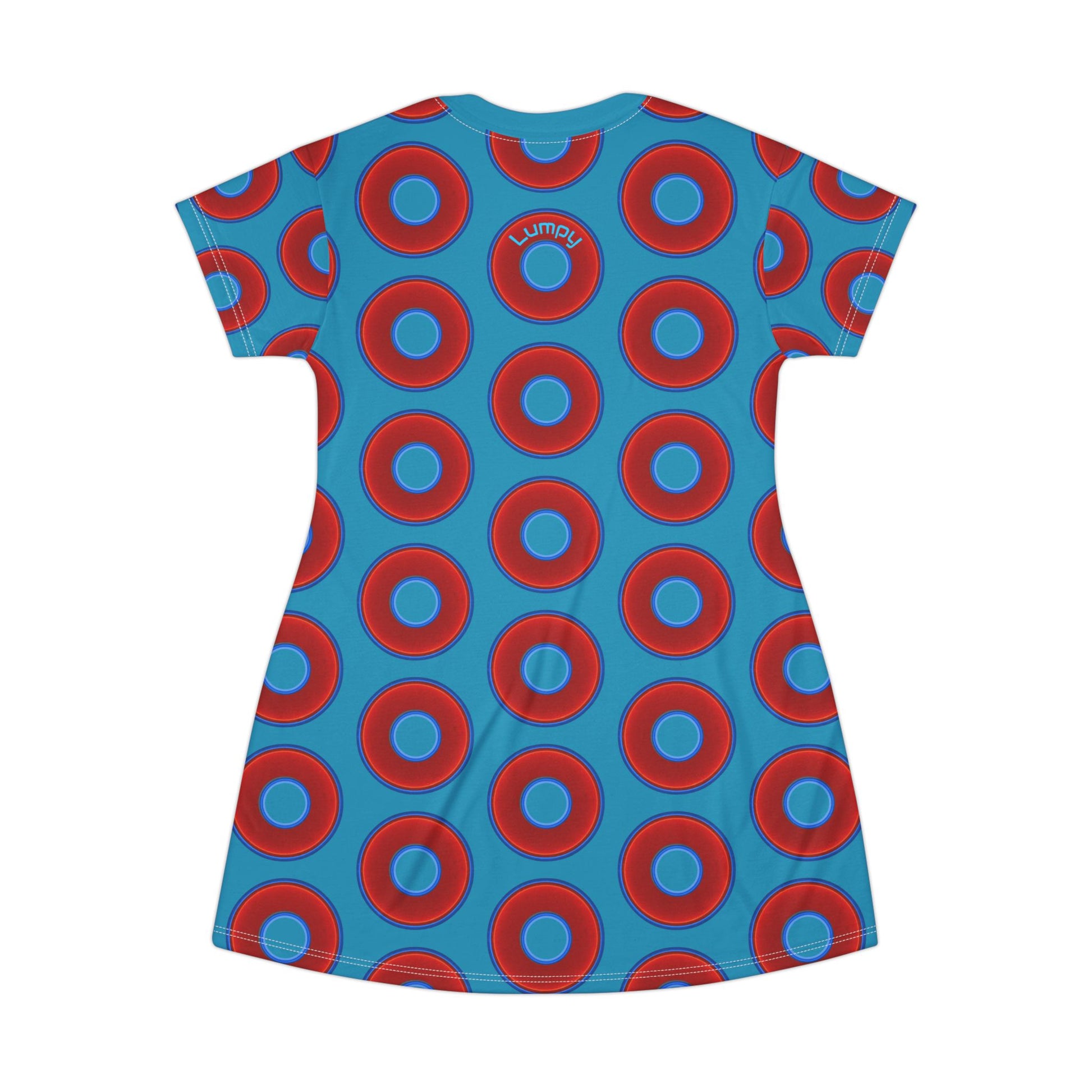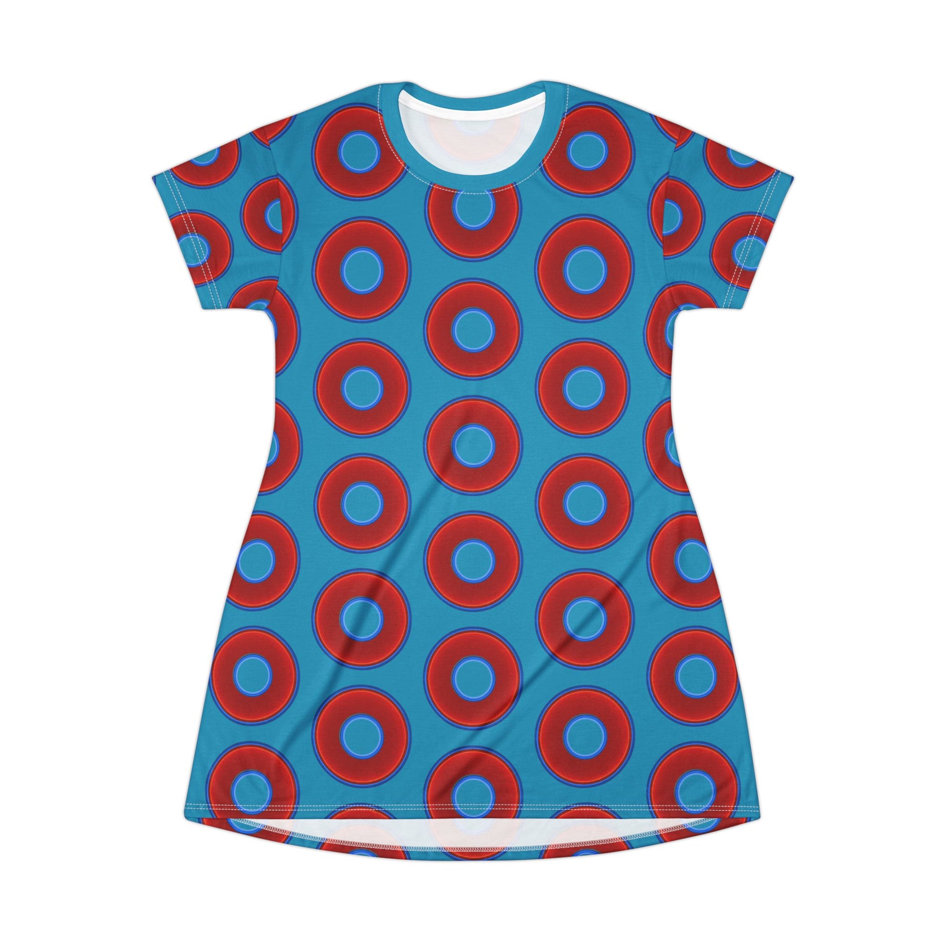 Not a Muumuu AOP Tee Shirt Dress - red vivid donuts w/aquamarine blue background