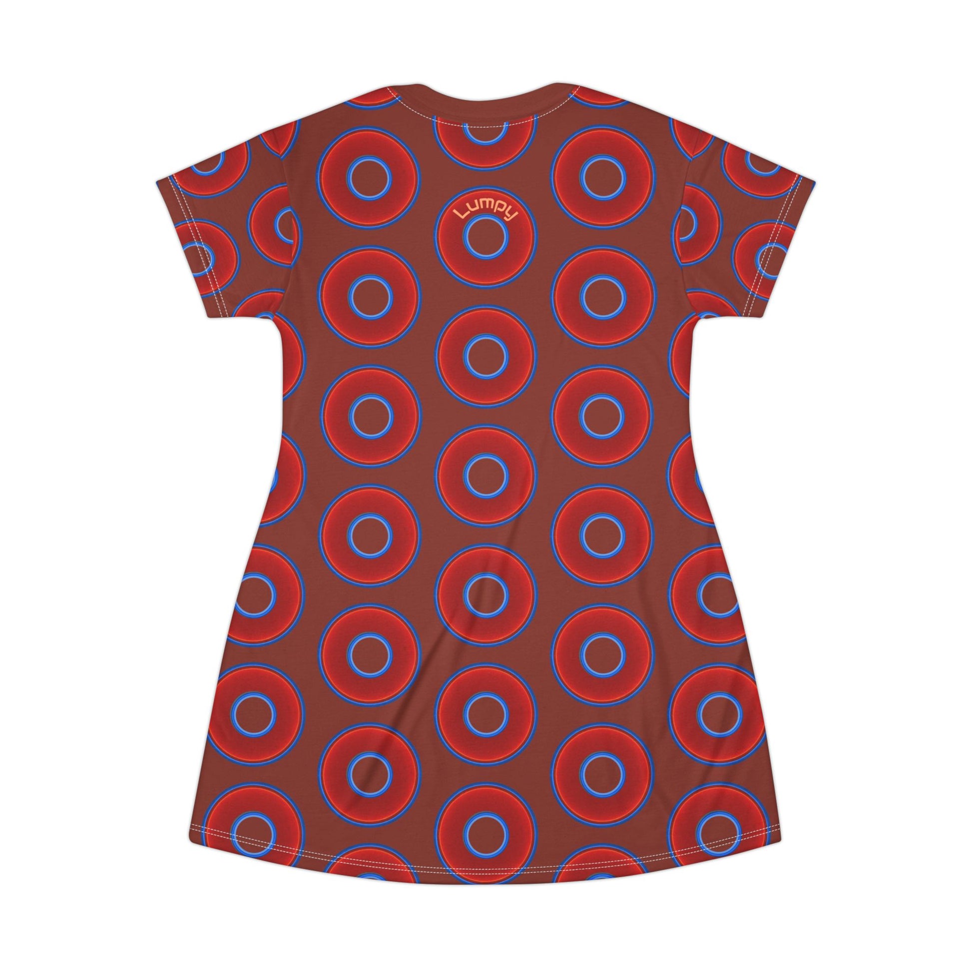 Not a Muumuu AOP Tee Shirt Dress - red vivid donuts w/burnt umber background