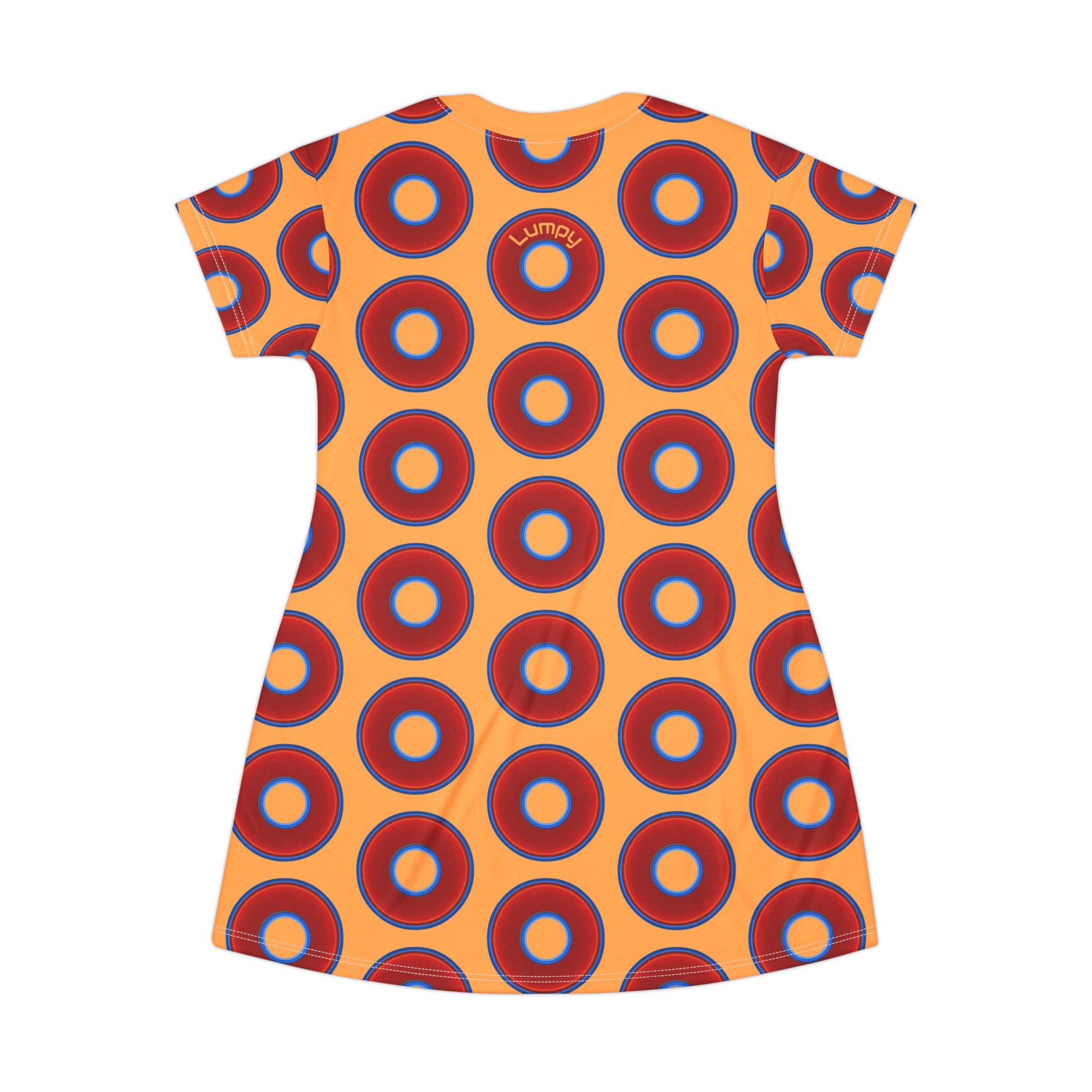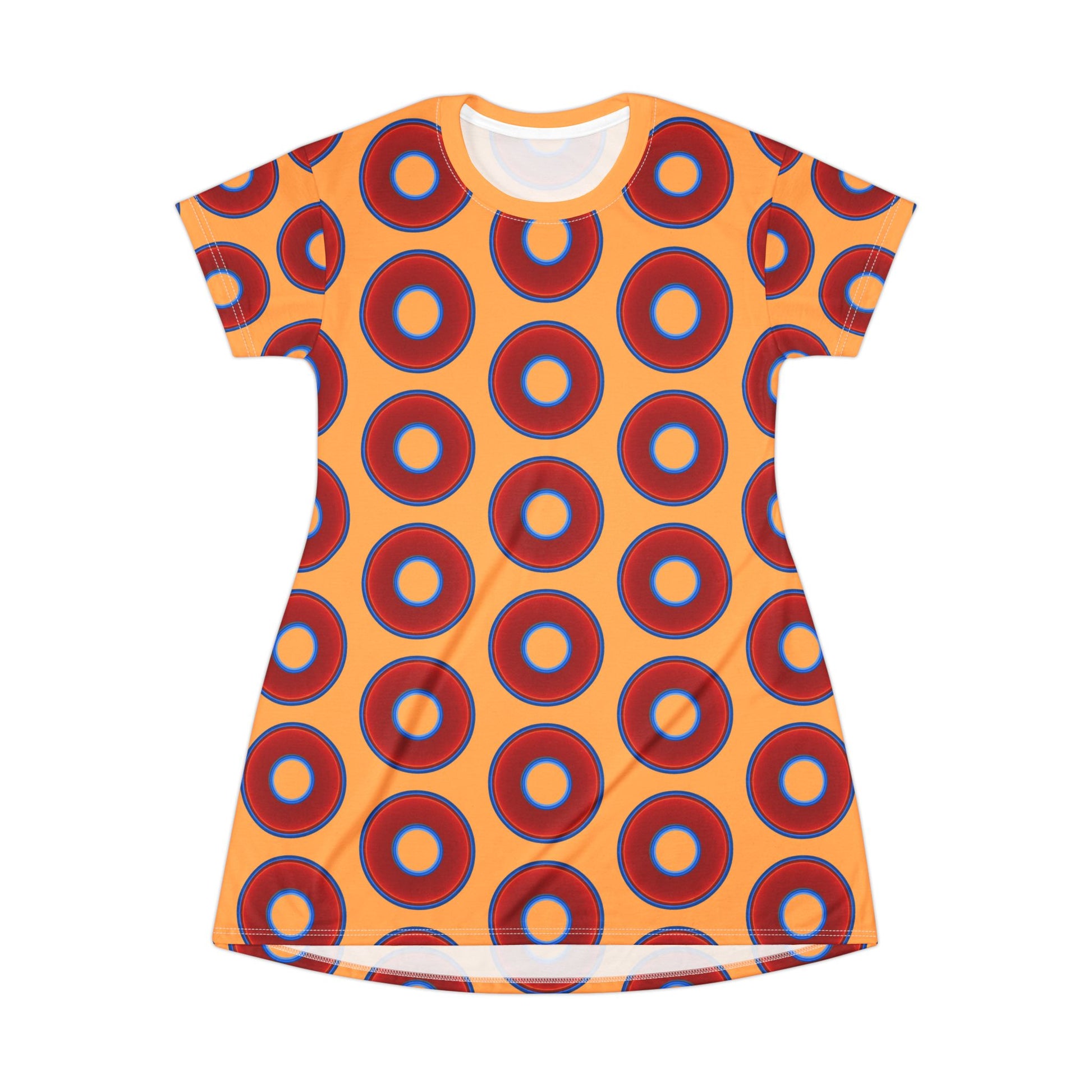 Not a Muumuu AOP Tee Shirt Dress - red vivid donuts w/creamsicle orange background