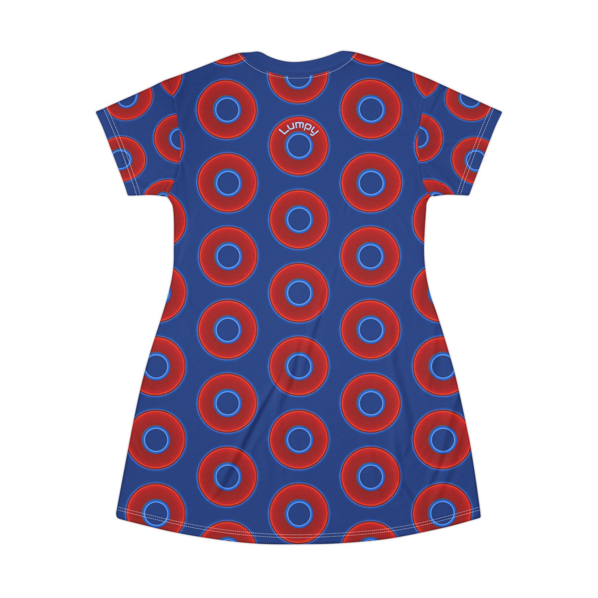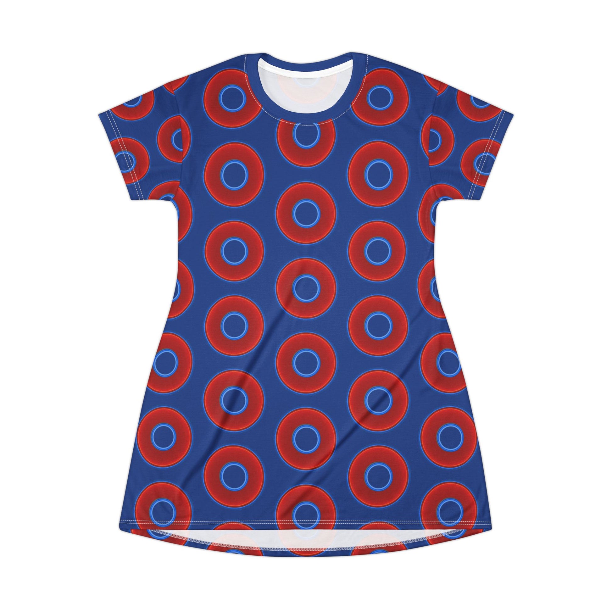 Not a Muumuu AOP Tee Shirt Dress - red vivid donuts w/dark blue background