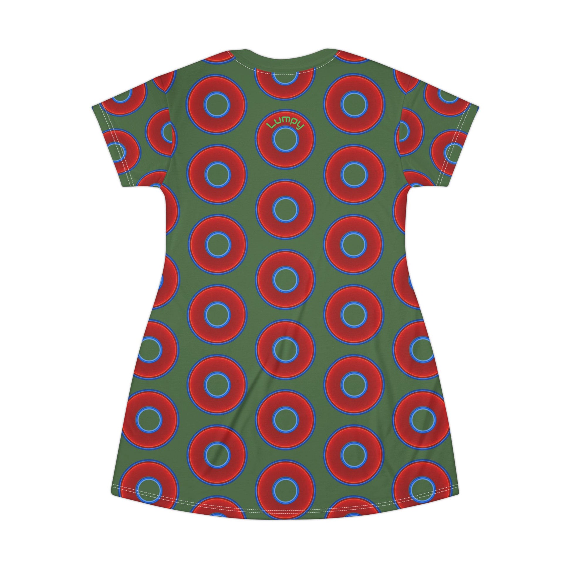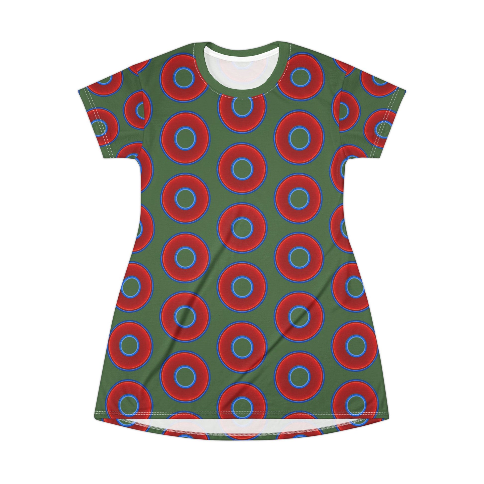 Not a Muumuu AOP Tee Shirt Dress - red vivid donuts w/dark Fenway green background