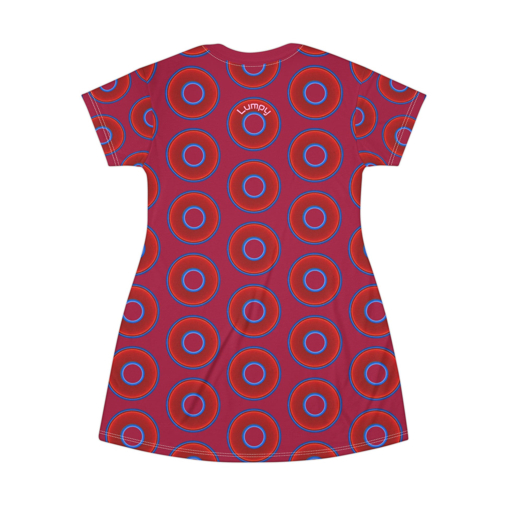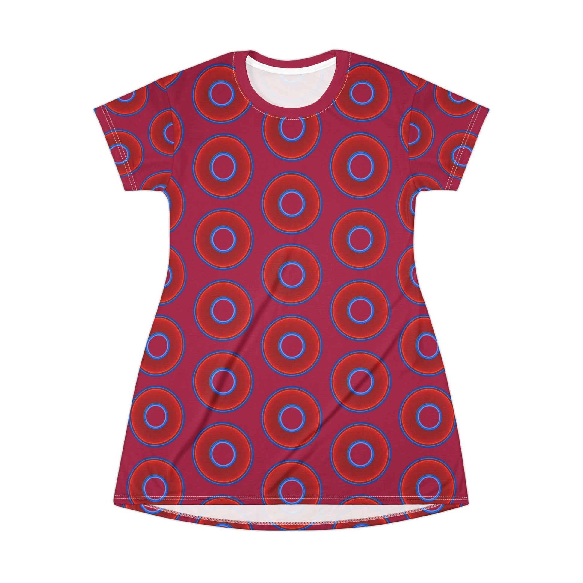 Not a Muumuu AOP Tee Shirt Dress - red vivid donuts w/dark magenta background