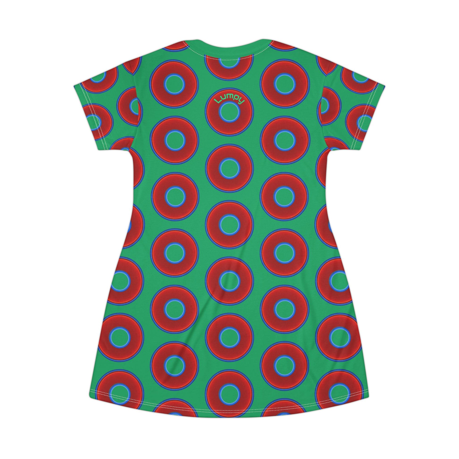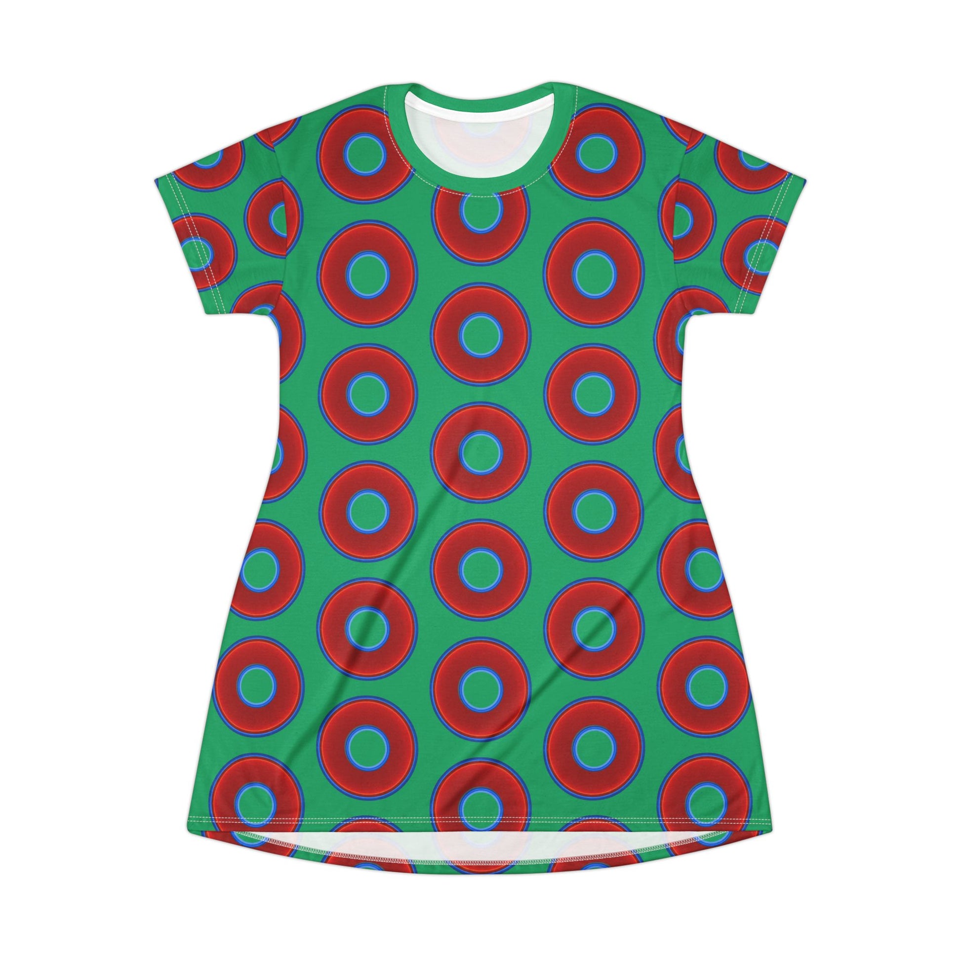 Not a Muumuu AOP Tee Shirt Dress - red vivid donuts w/jade green background