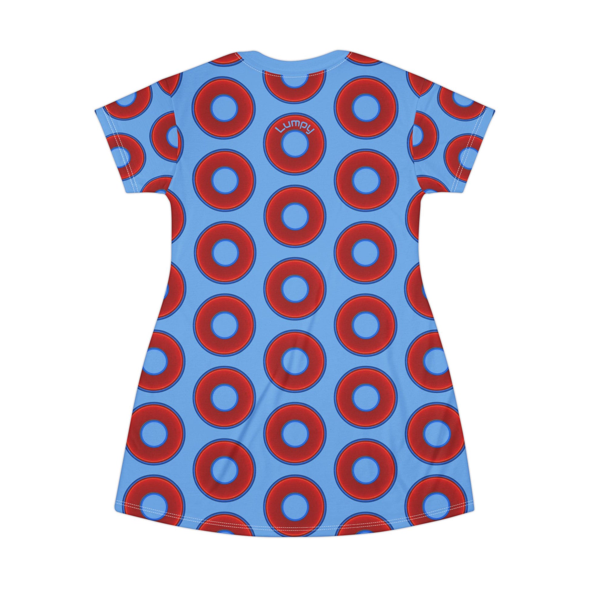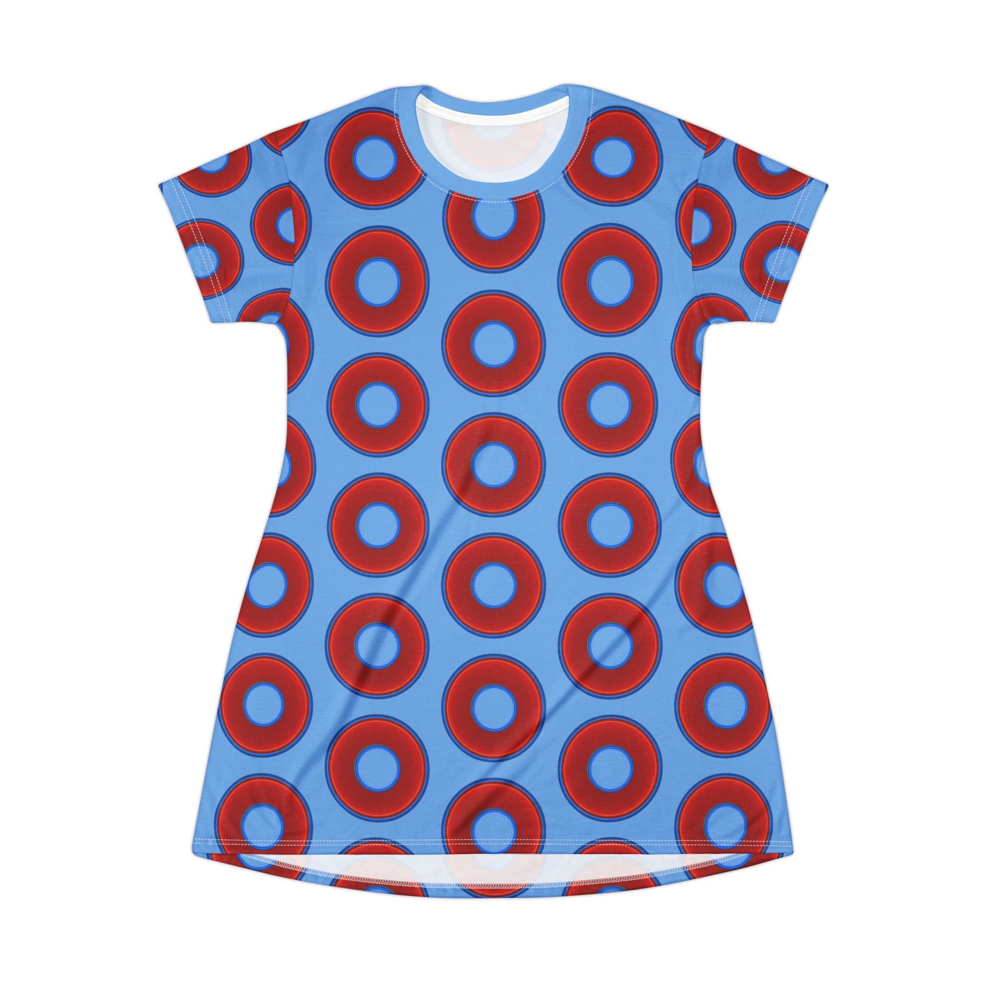 Not a Muumuu AOP Tee Shirt Dress - red vivid donuts w/light blue background