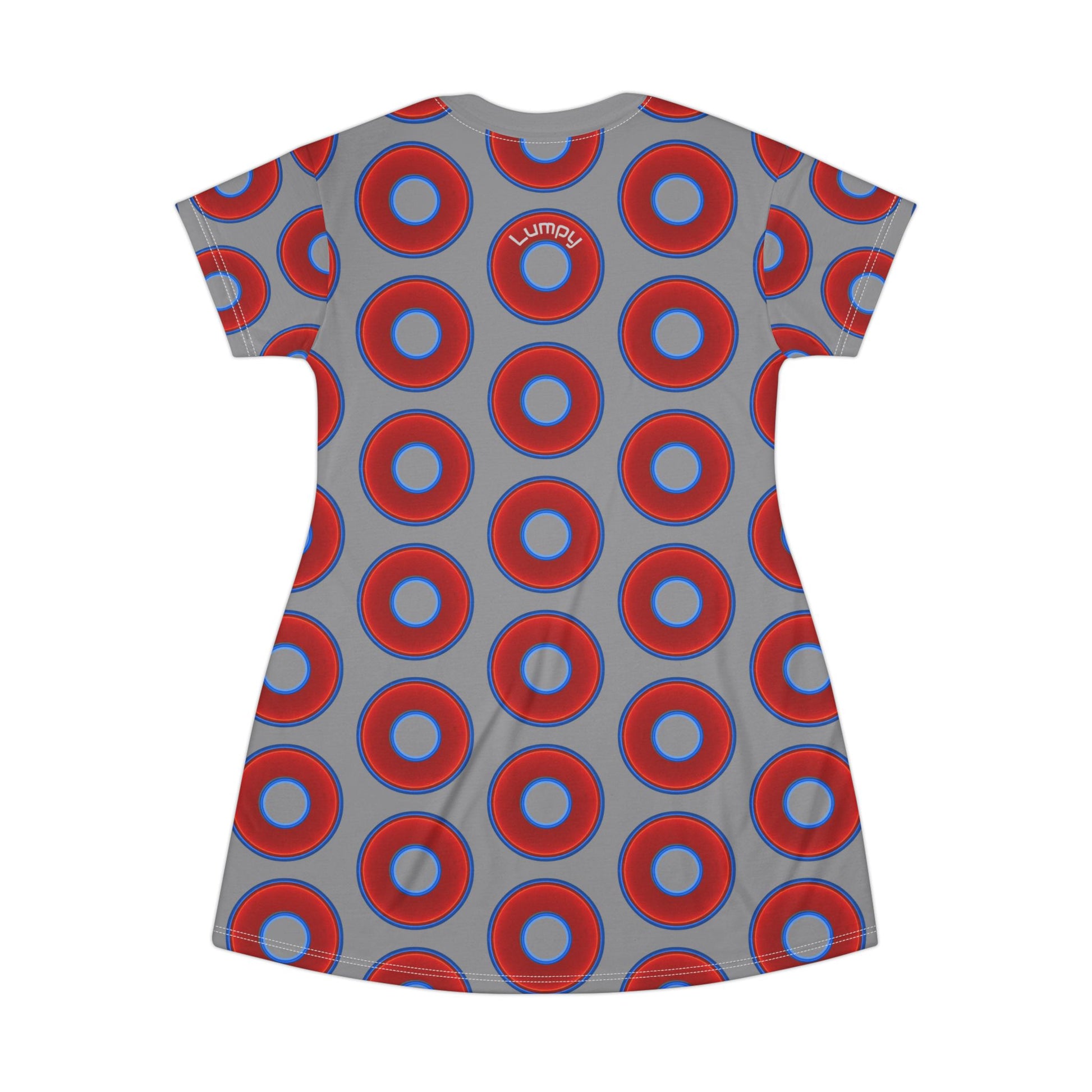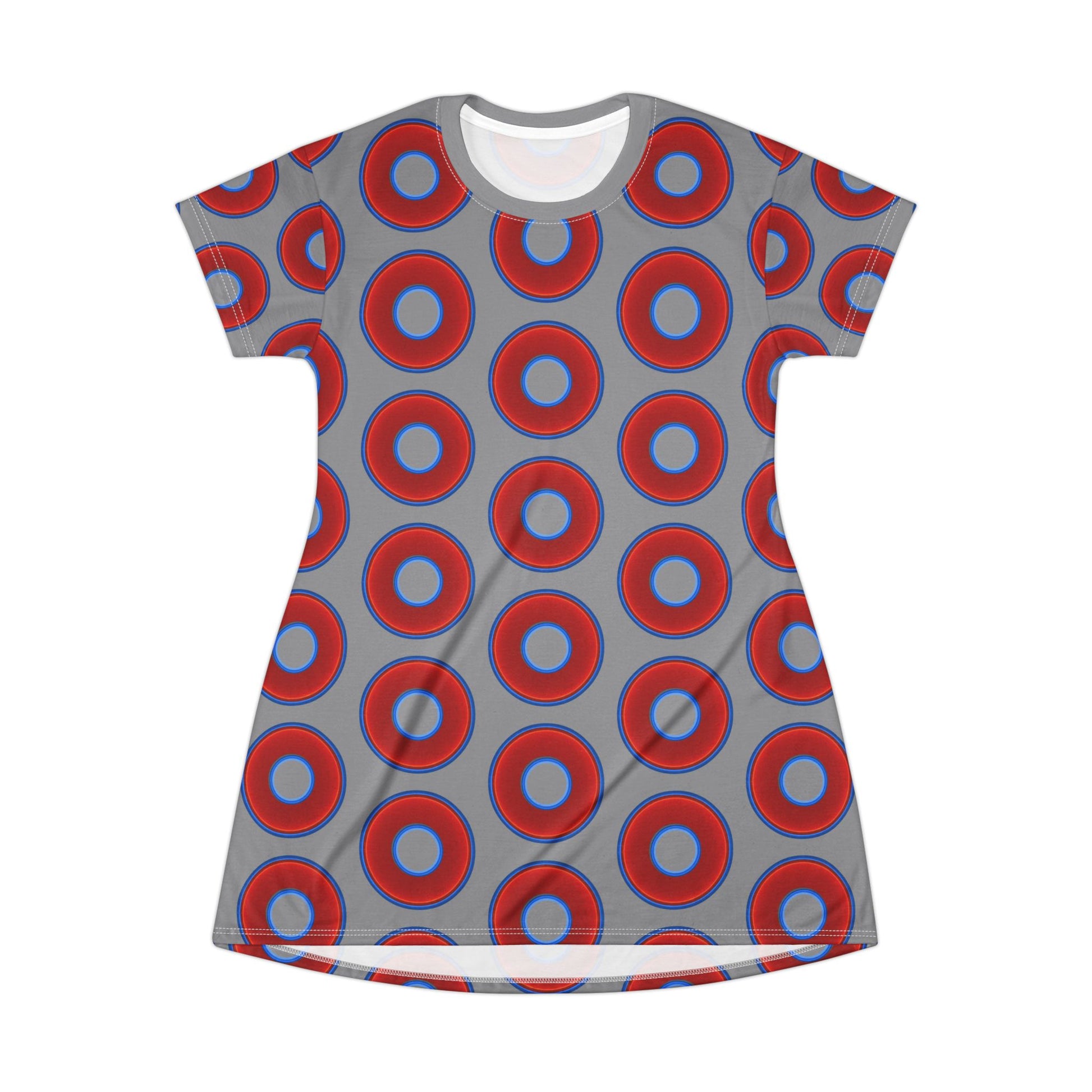 Not a Muumuu AOP Tee Shirt Dress - red vivid donuts w/light gray background
