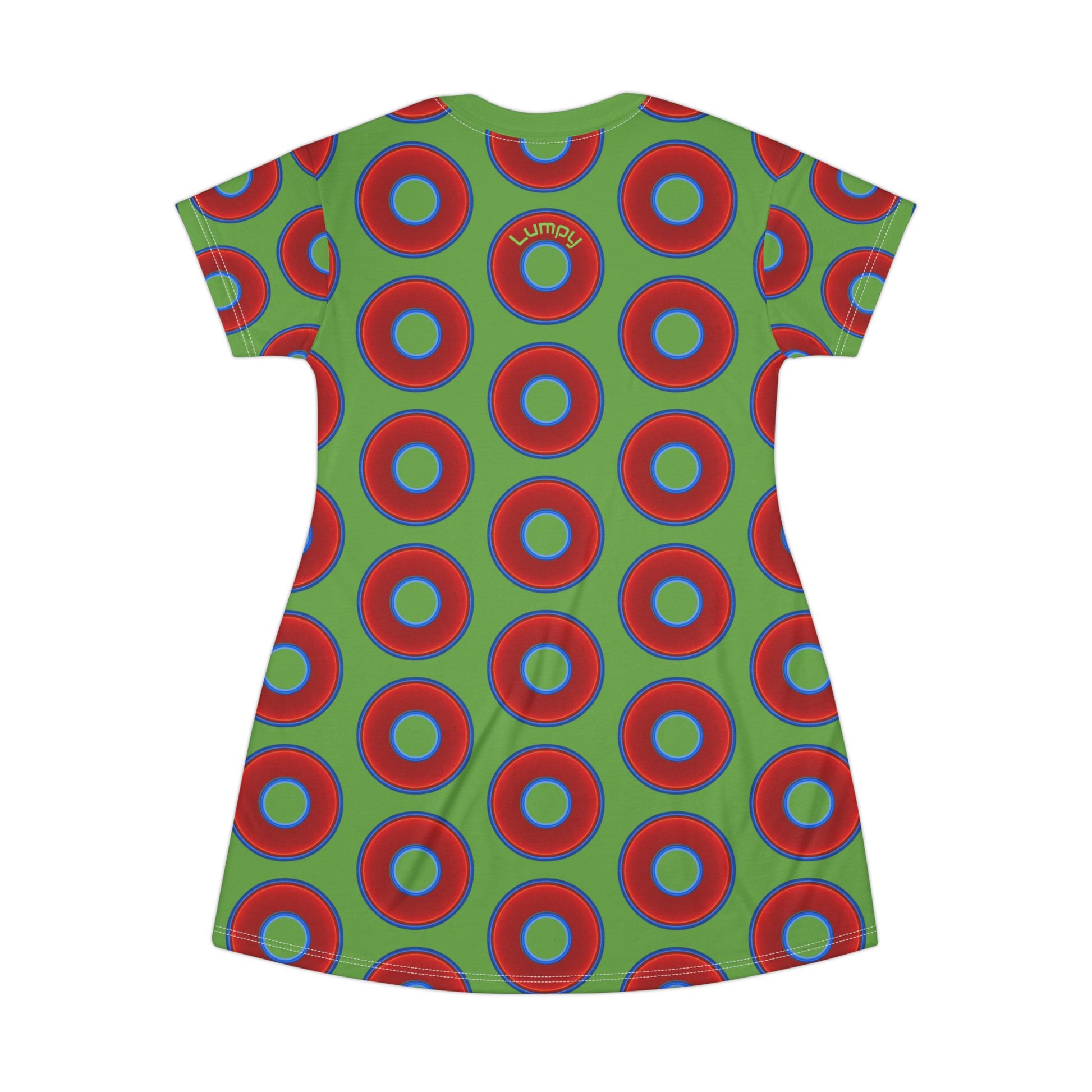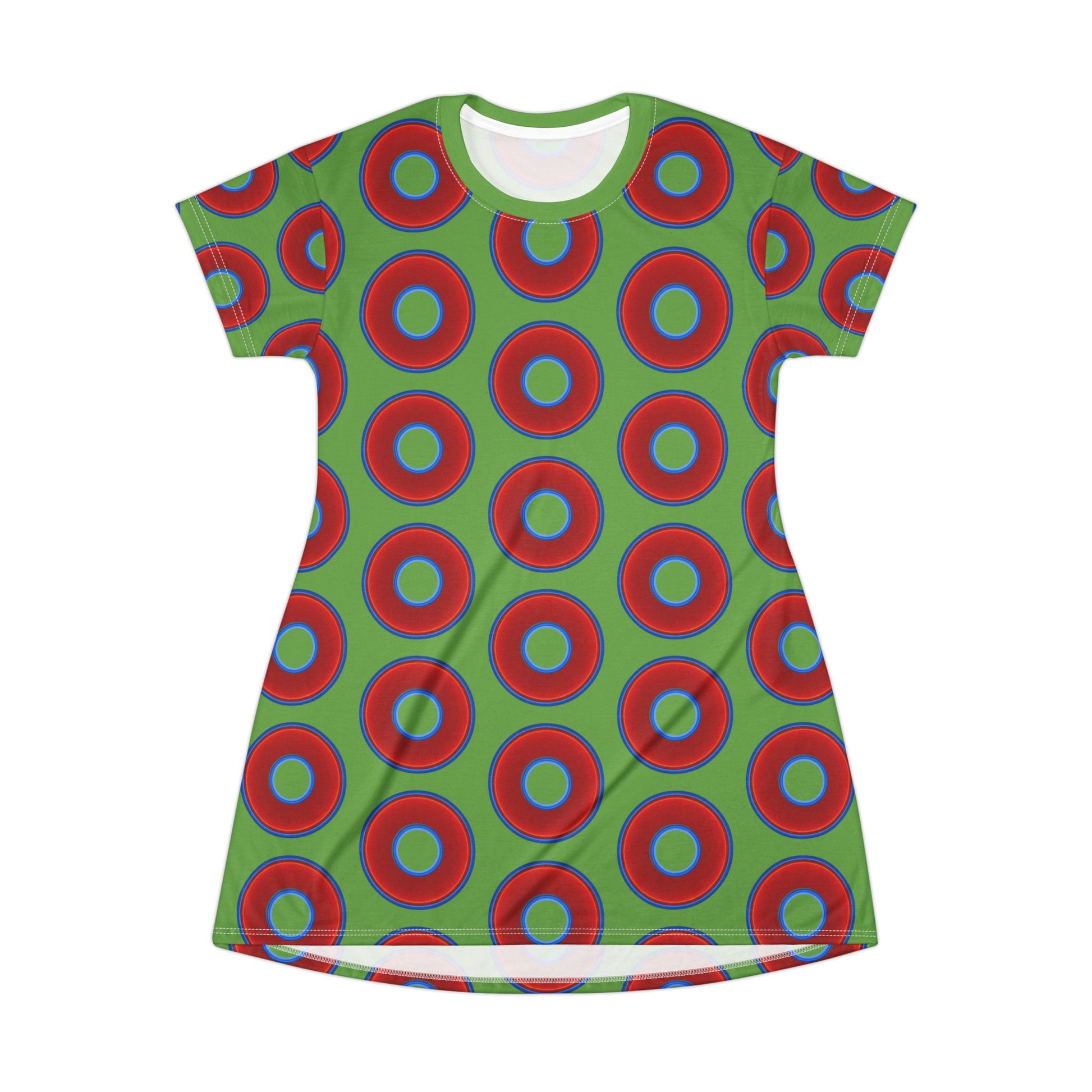Not a Muumuu AOP Tee Shirt Dress - red vivid donuts w/light green background