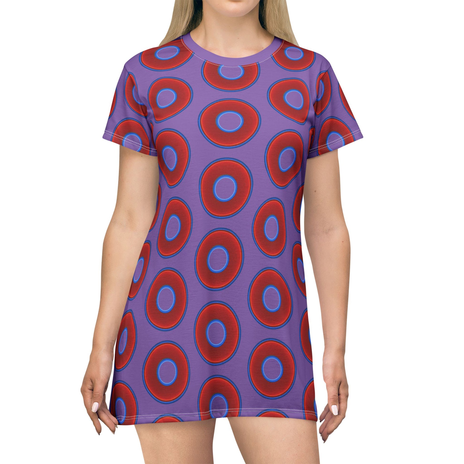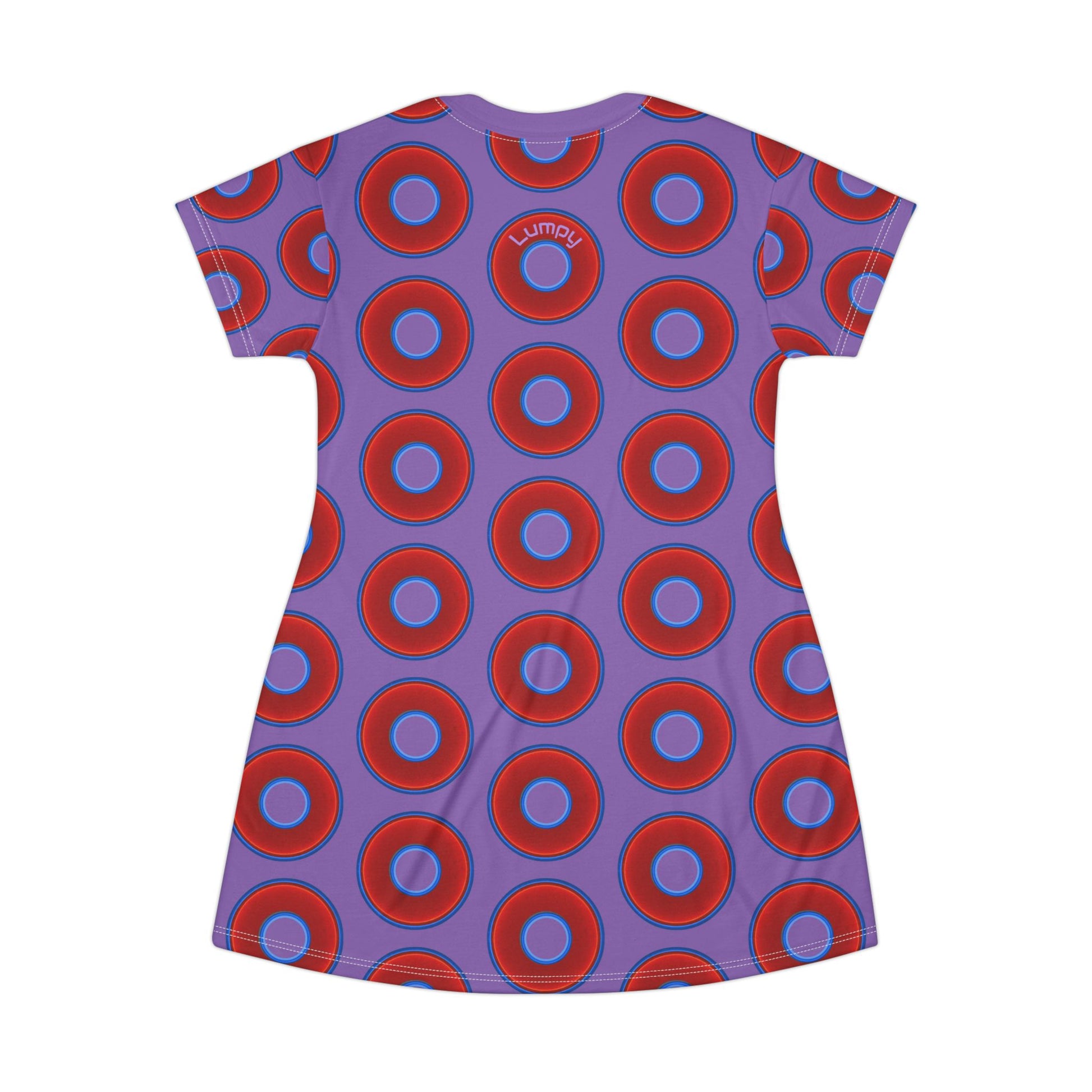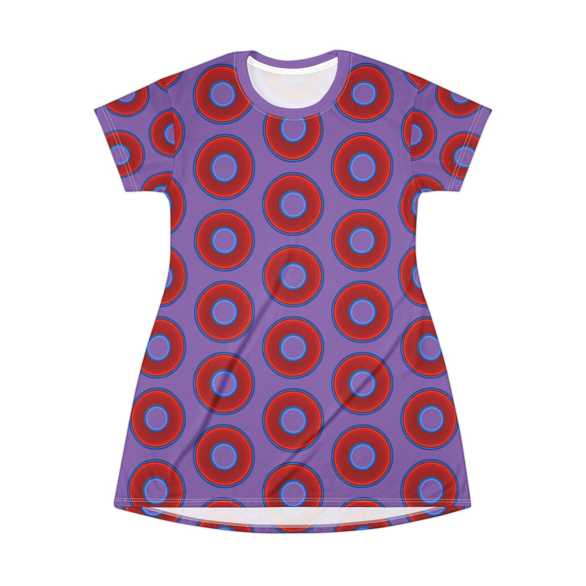 Not a Muumuu AOP Tee Shirt Dress - red vivid donuts w/light purple background