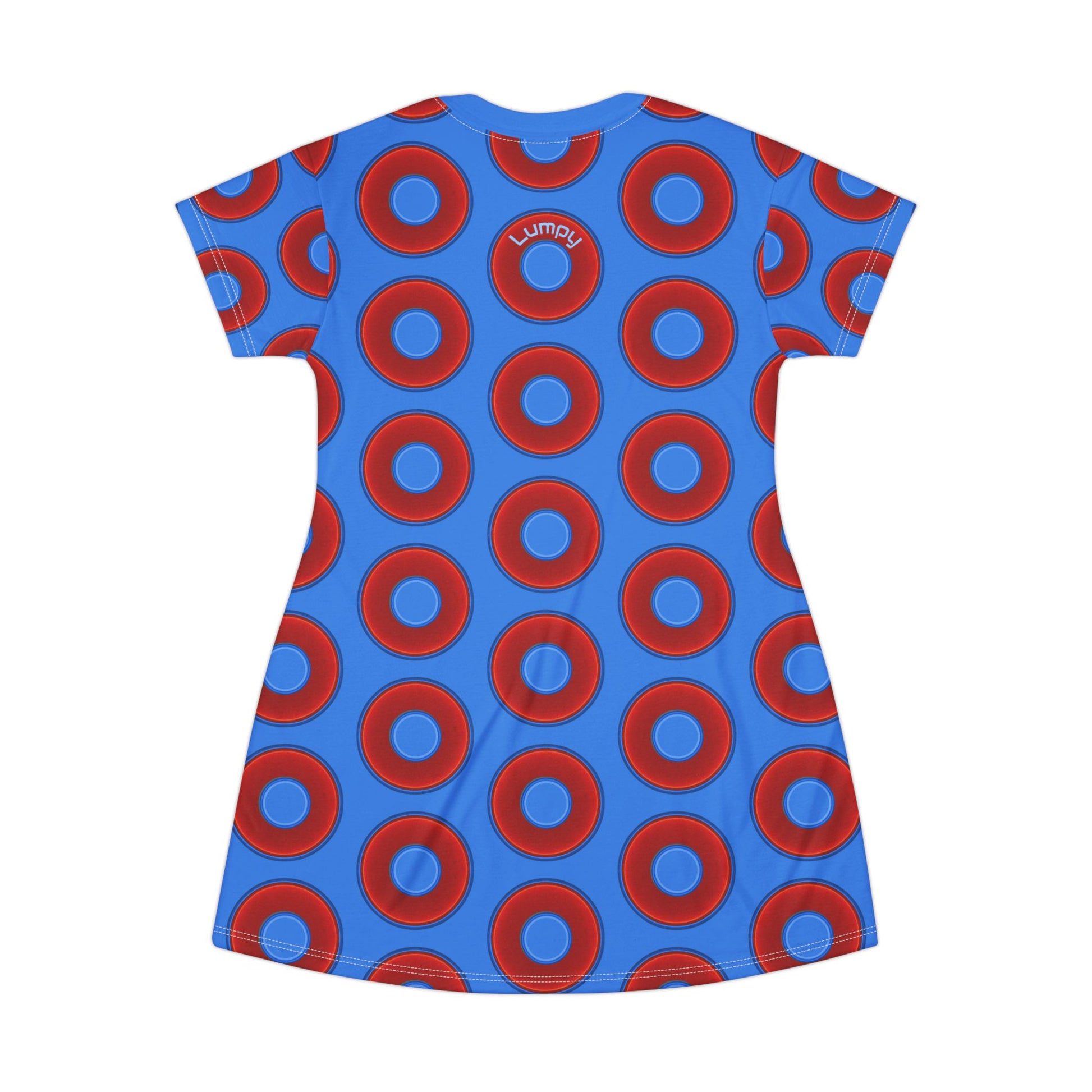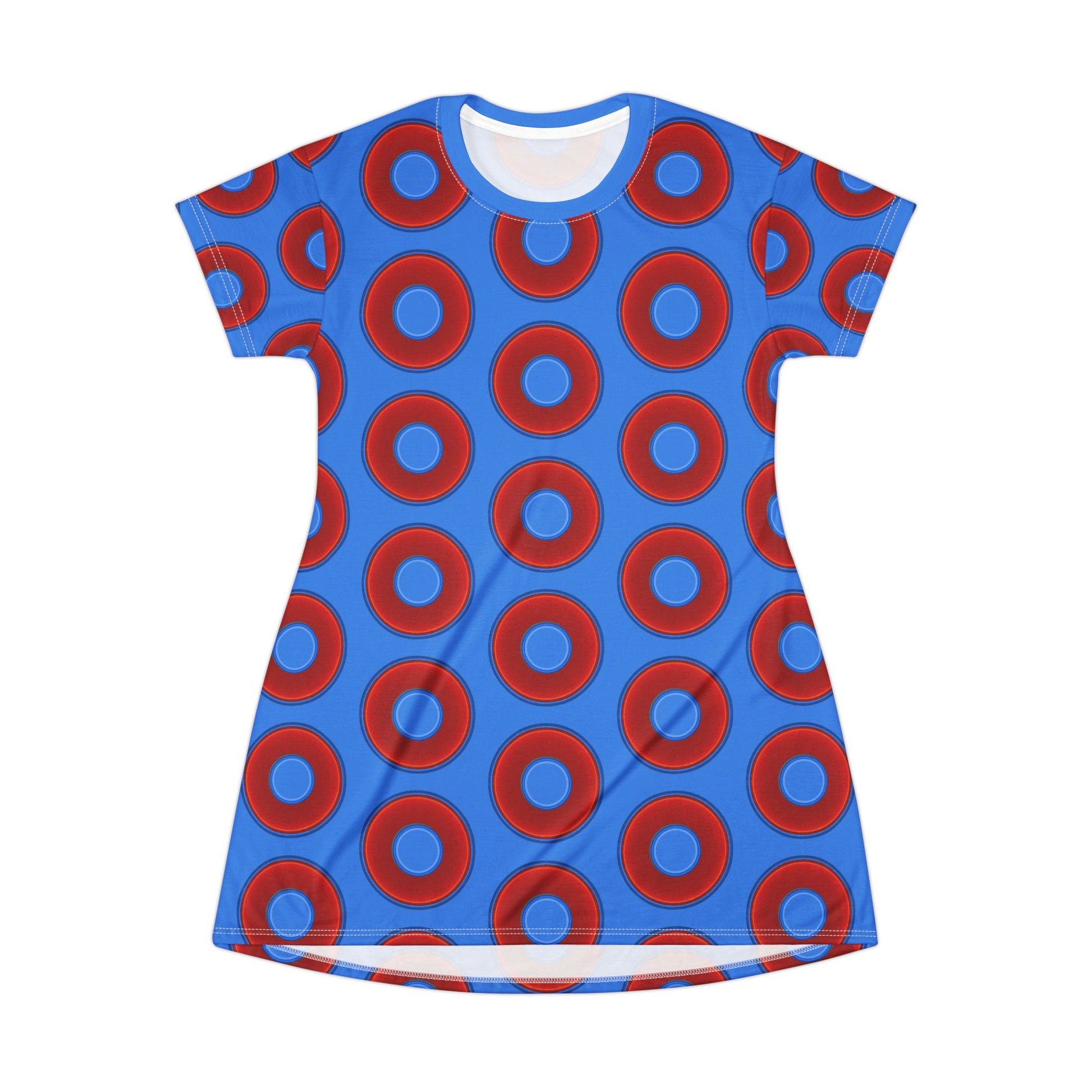 Not a Muumuu AOP Tee Shirt Dress - red vivid donuts w/light royal blue background