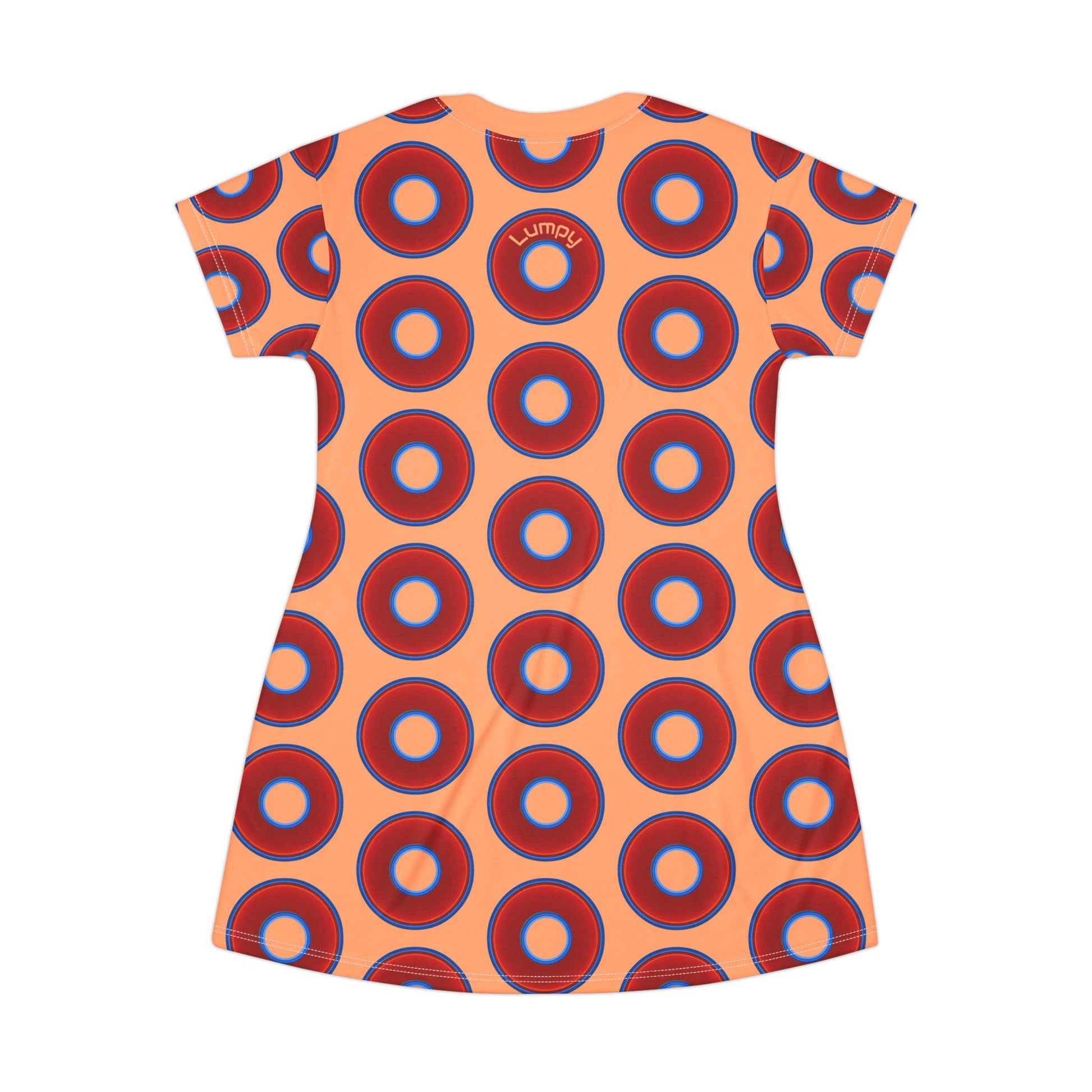 Not a Muumuu AOP Tee Shirt Dress - red vivid donuts w/peach background