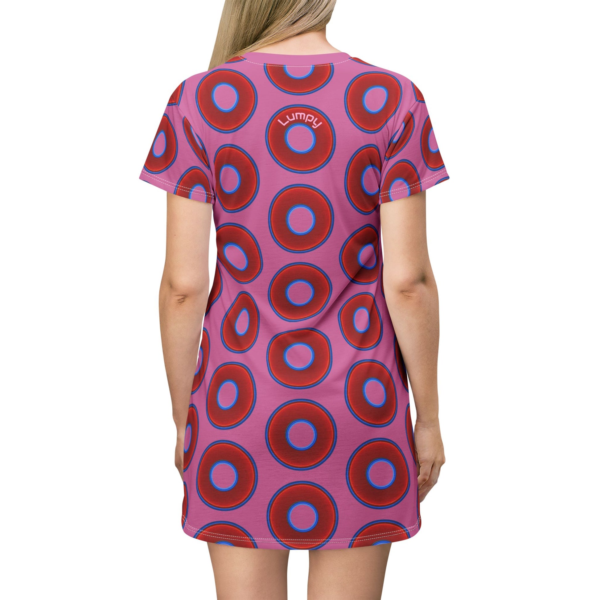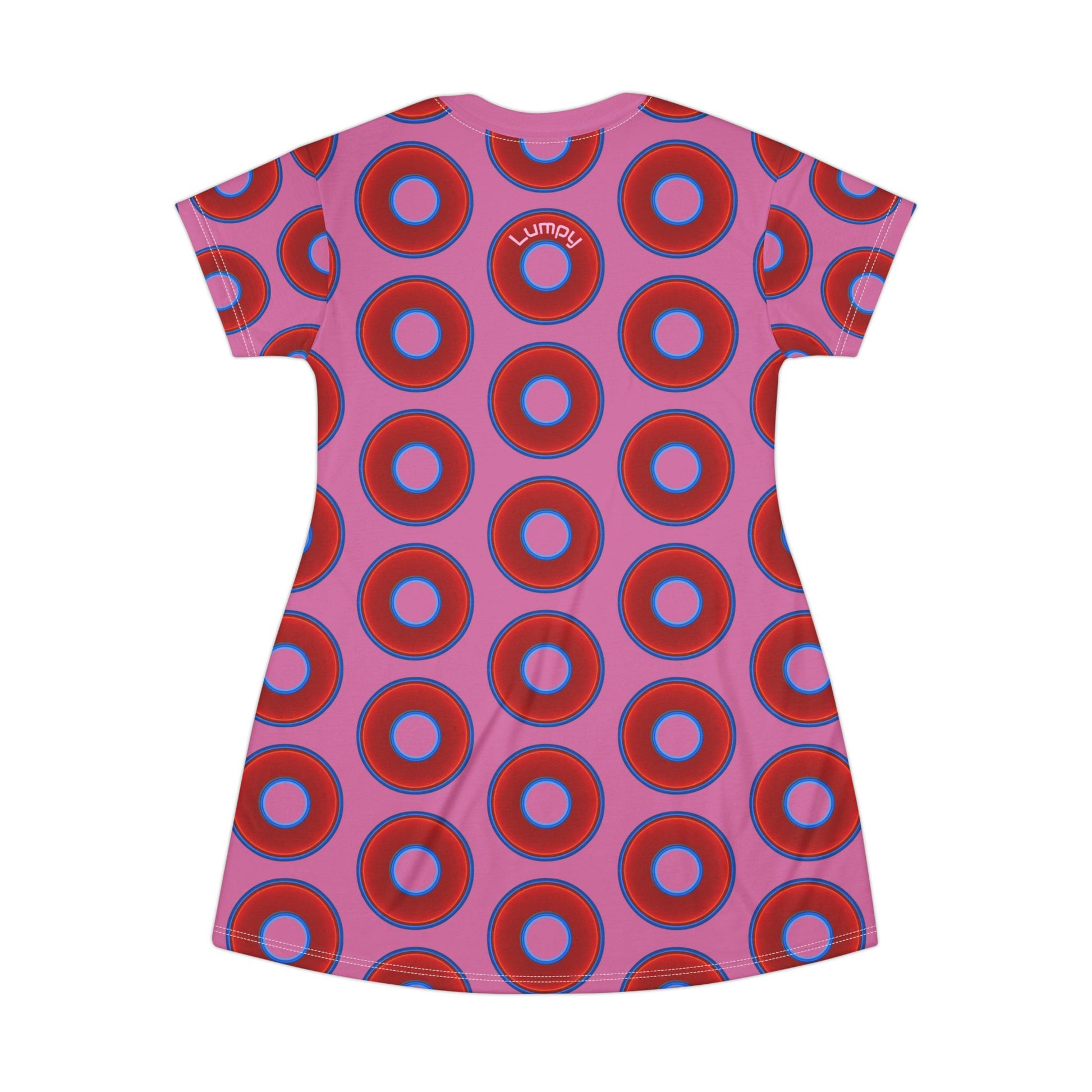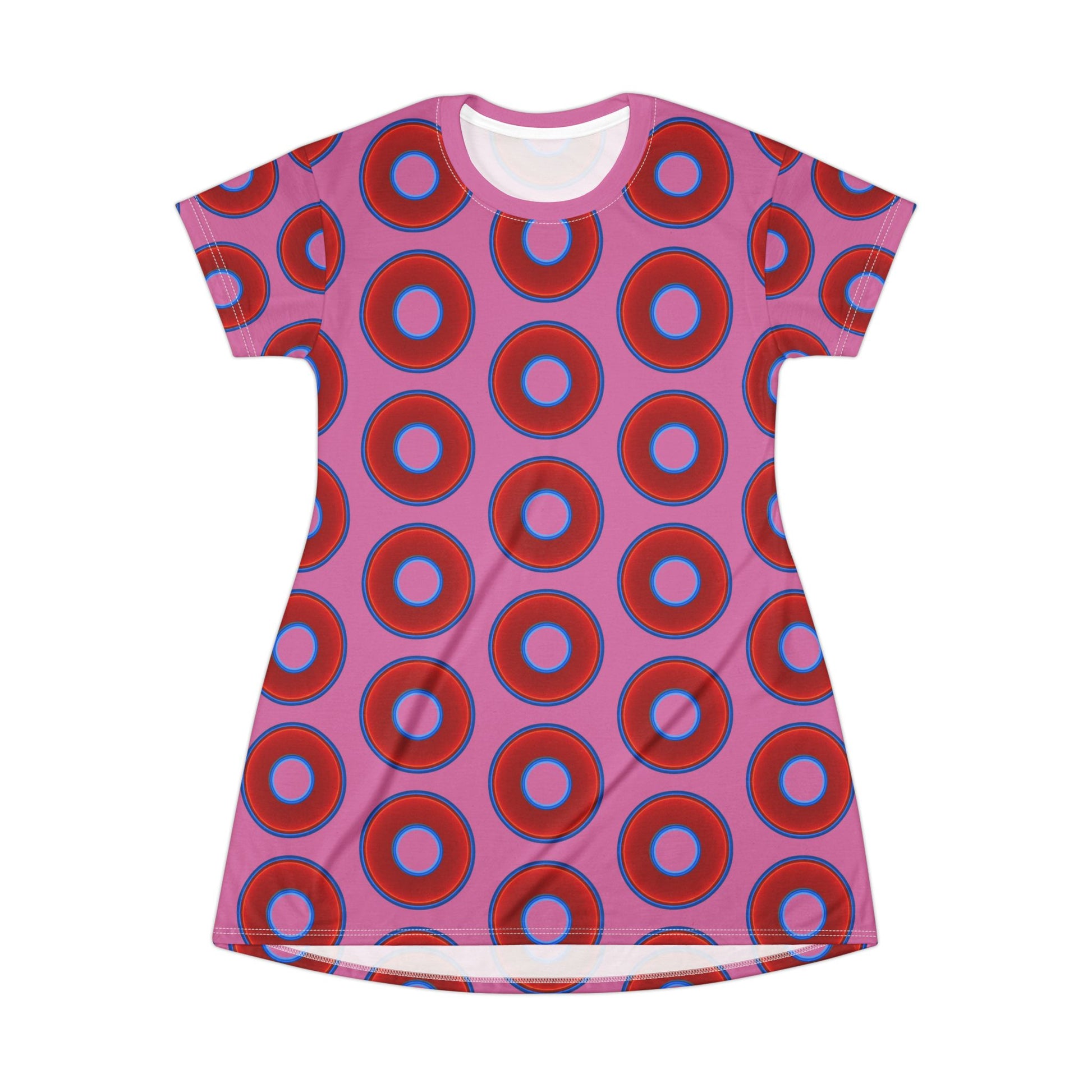 Not a Muumuu AOP Tee Shirt Dress - red vivid donuts w/pink background