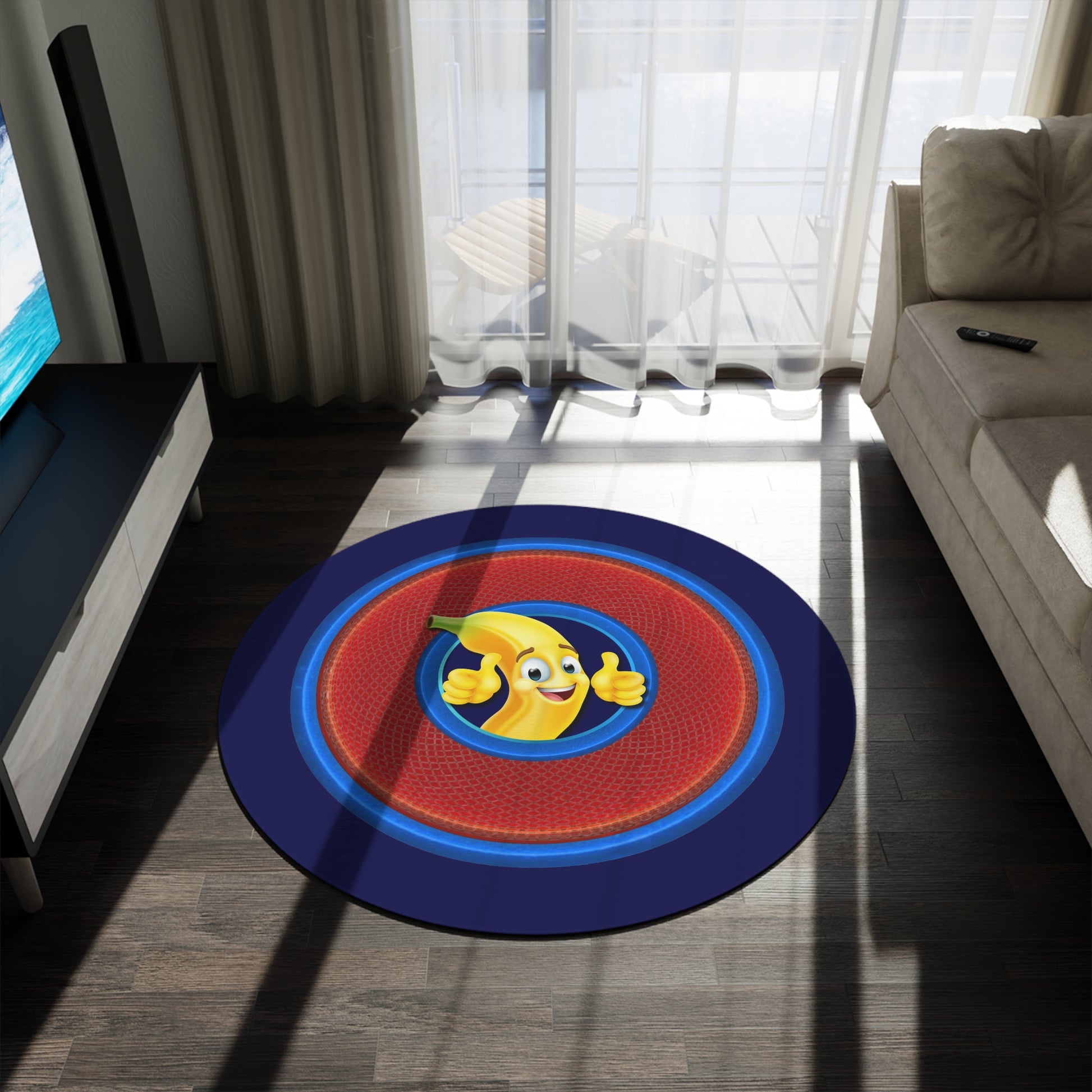 Round Room - 5 ft x 5 ft Lumpy Donut Rug - "Banana Bread Donut " - rustic red donut w/navy background - variant 1