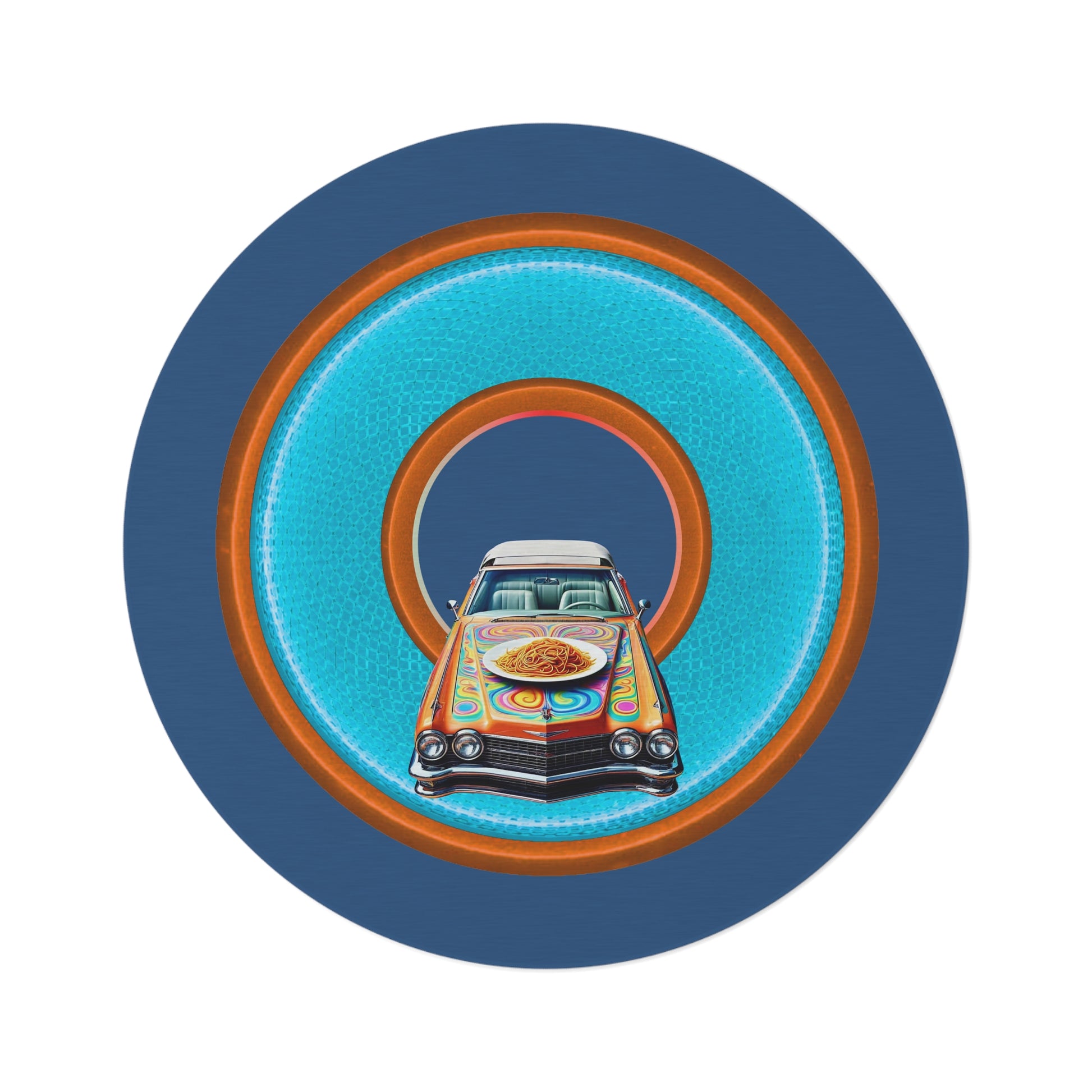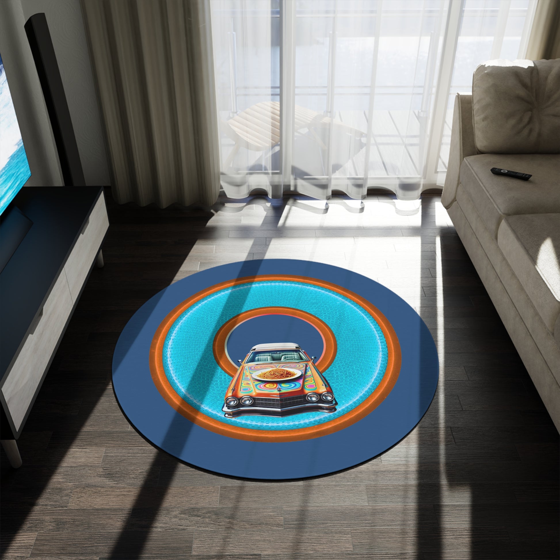 Round Room - 5 ft x 5 ft Lumpy Donut Rug - "Caddy Spaghetti Incident Donut Rug" - rustic light blue/orange donut w/light navy background - variant 3