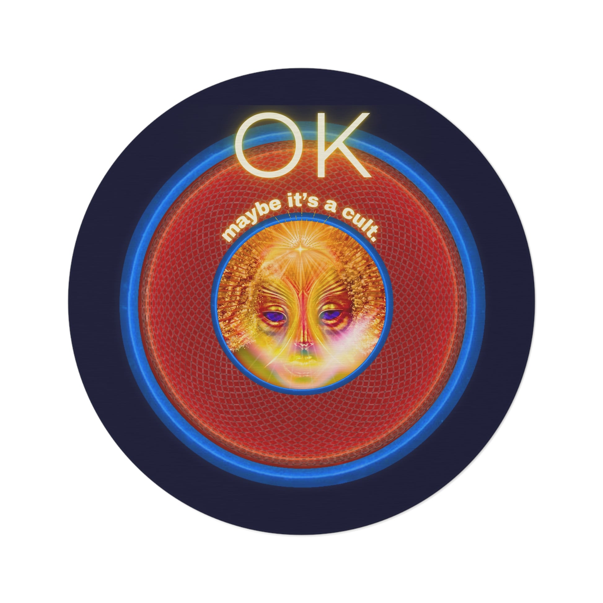 Round Room - 5 ft x 5 ft Lumpy Donut Rug - "Conjurers of Awesome Donuts" - rustic red/blue donut w/dark navy background - variant 3