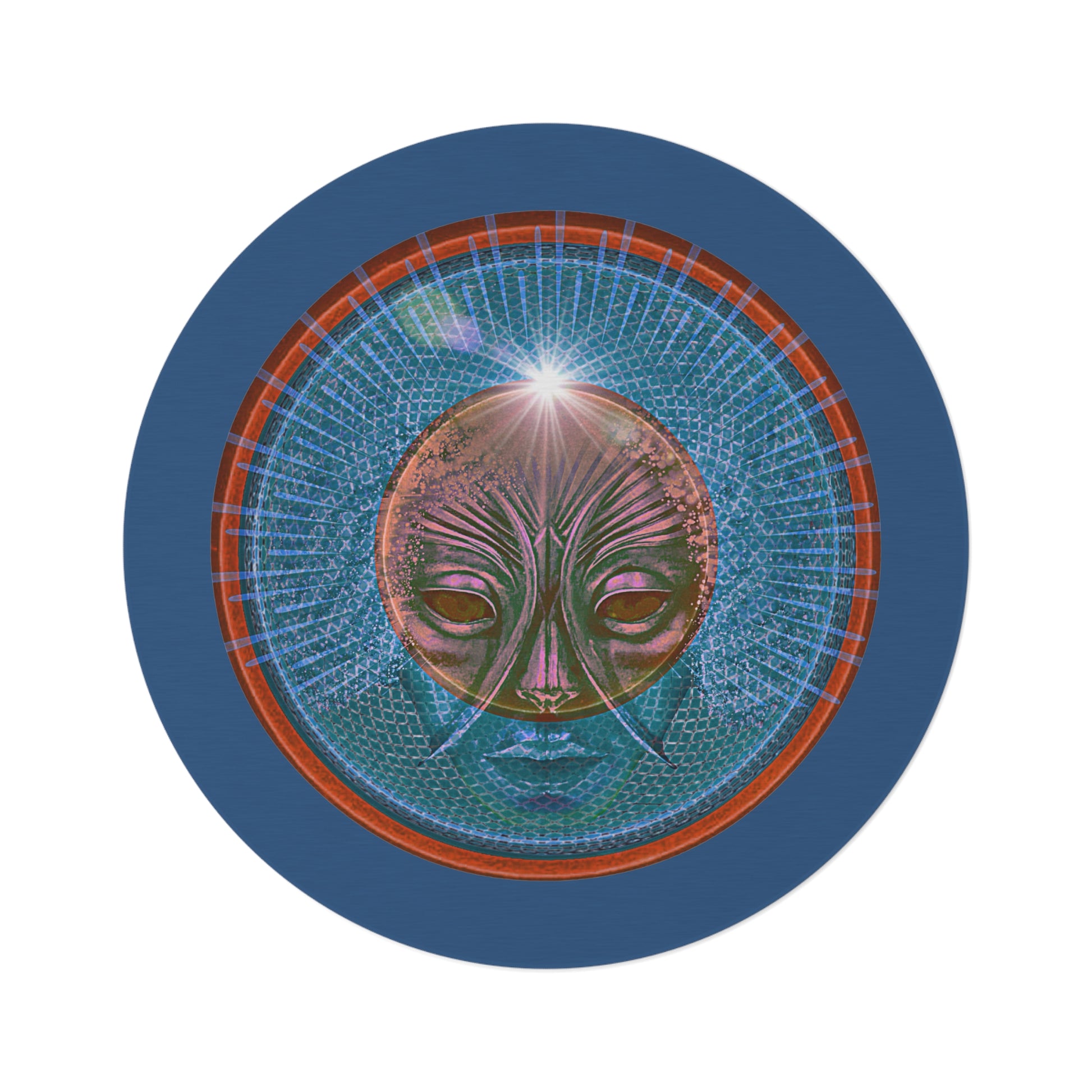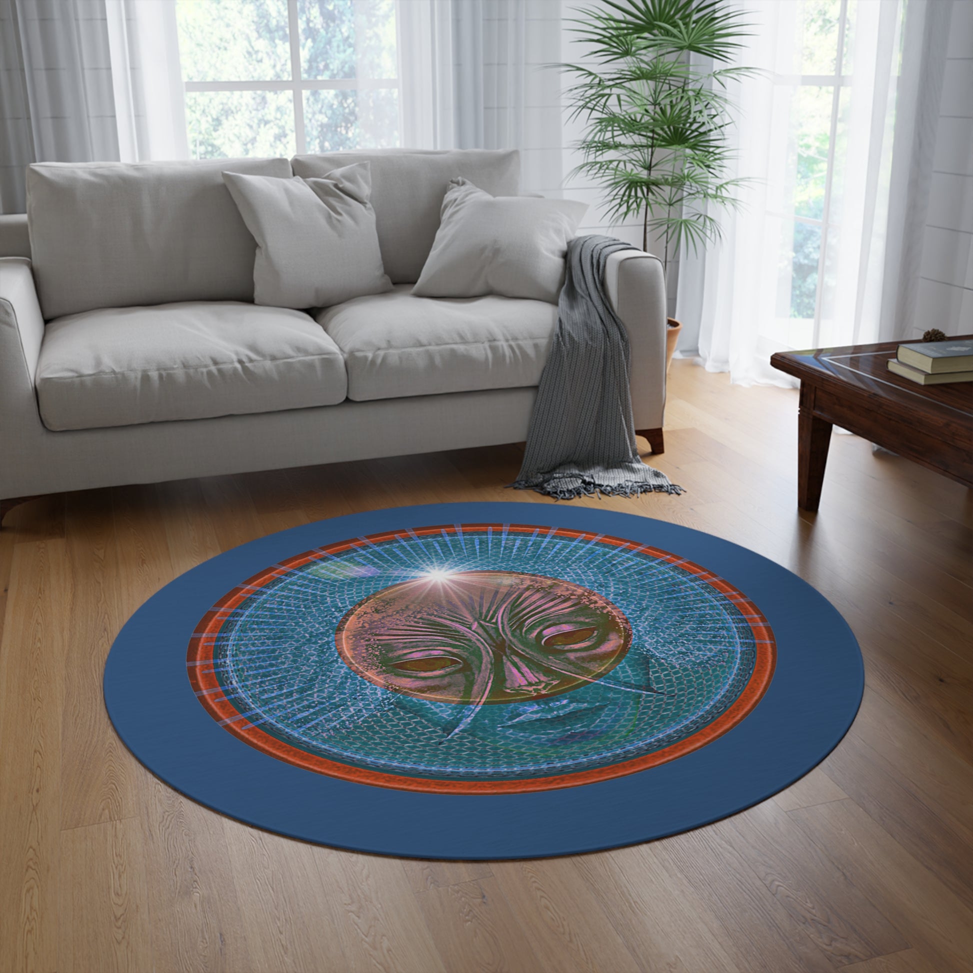 Round Room - 5 ft x 5 ft Lumpy Donut Rug - "Conjurers of Awesome Donuts" - rustic red/blue donut w/light navy background - variant 2