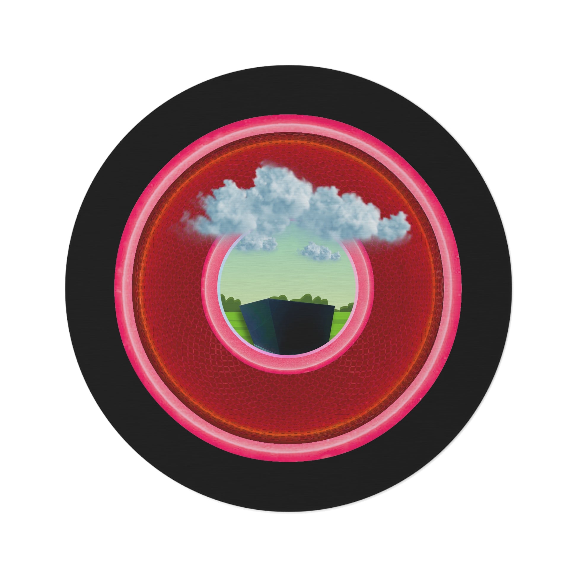 Round Room - 5 ft x 5 ft Lumpy Donut Rug - "Got Rhombus Rug?" - rustic red/pink donut w/black background - variant 3