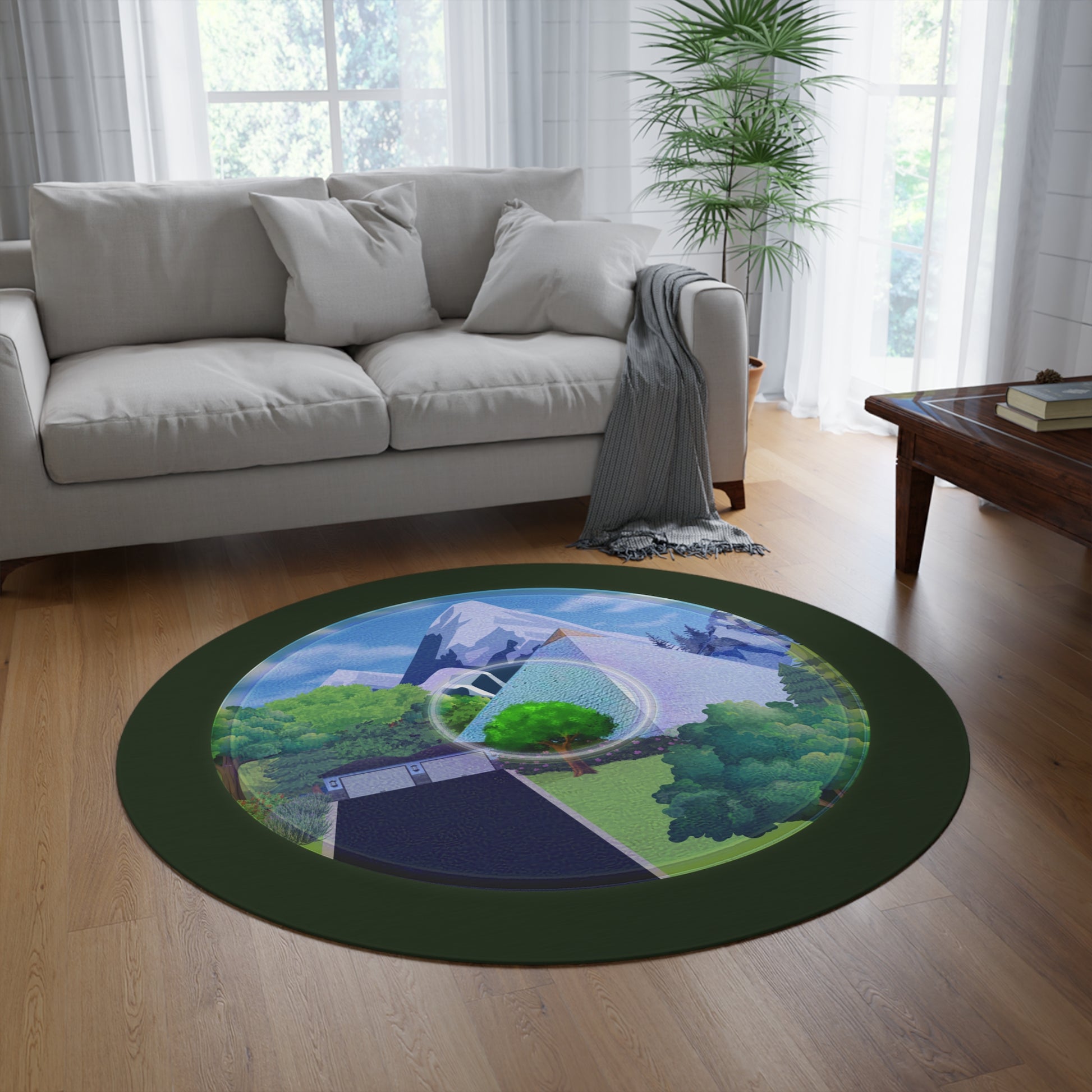 Round Room - 5 ft x 5 ft Lumpy Donut Rug - "Mansions of South Park Donut Rug" - green/blue pic donut w/deep forest green background - variant 2