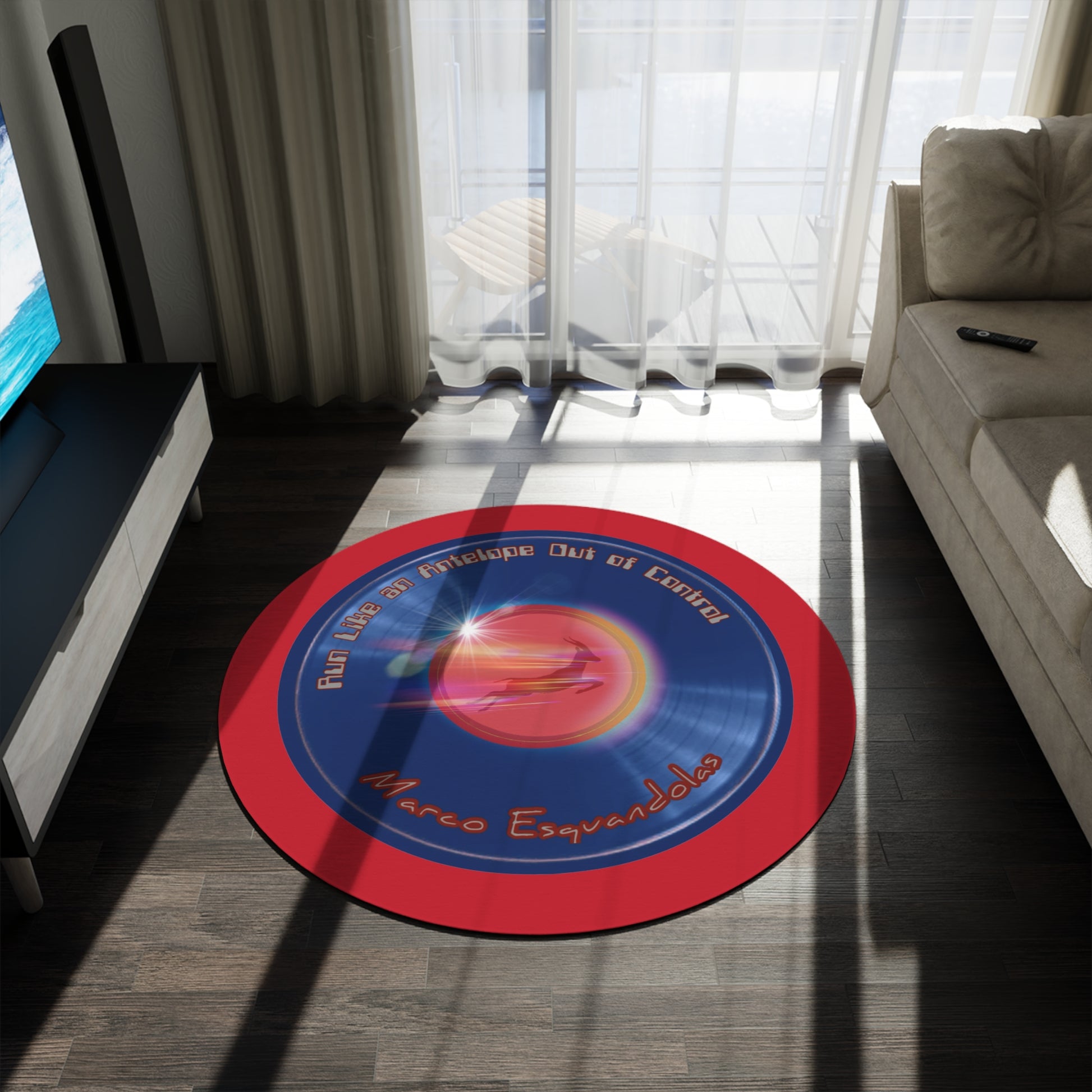 Round Room - 5 ft x 5 ft Lumpy Donut Rug - "Marco's Preferred Donut Rug" - vivid blue record donut w/dark red background