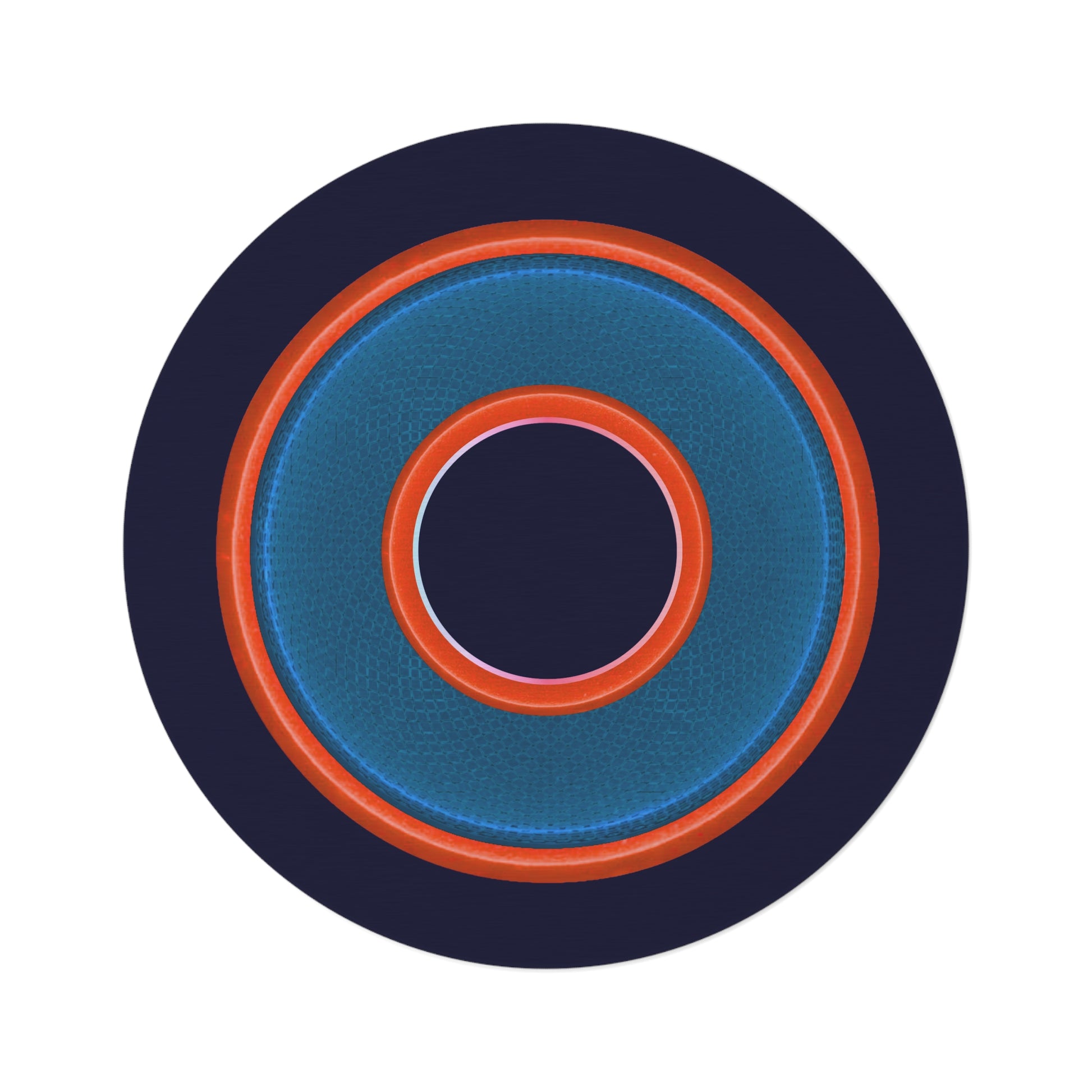 Round Room - 5 ft x 5 ft Lumpy Donut Rug - "Plain Donut" - rustic blue/light red donut w/navy background