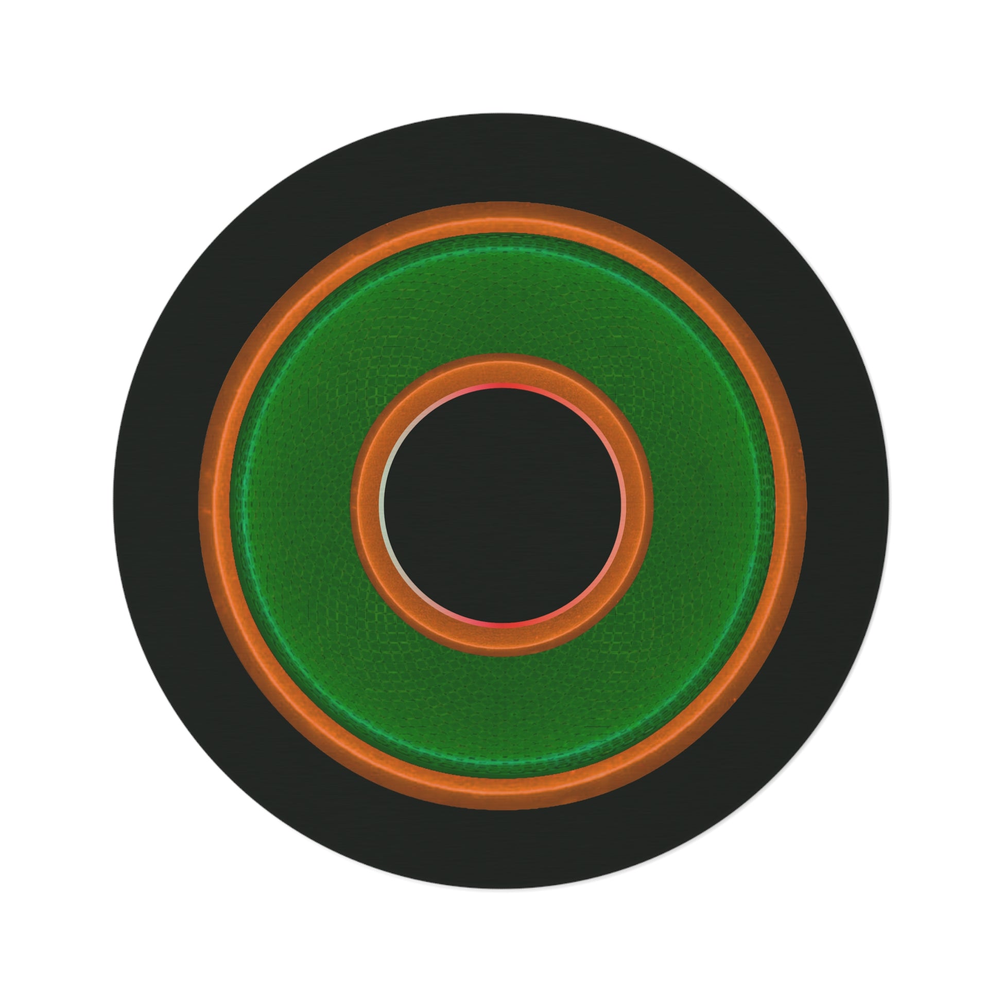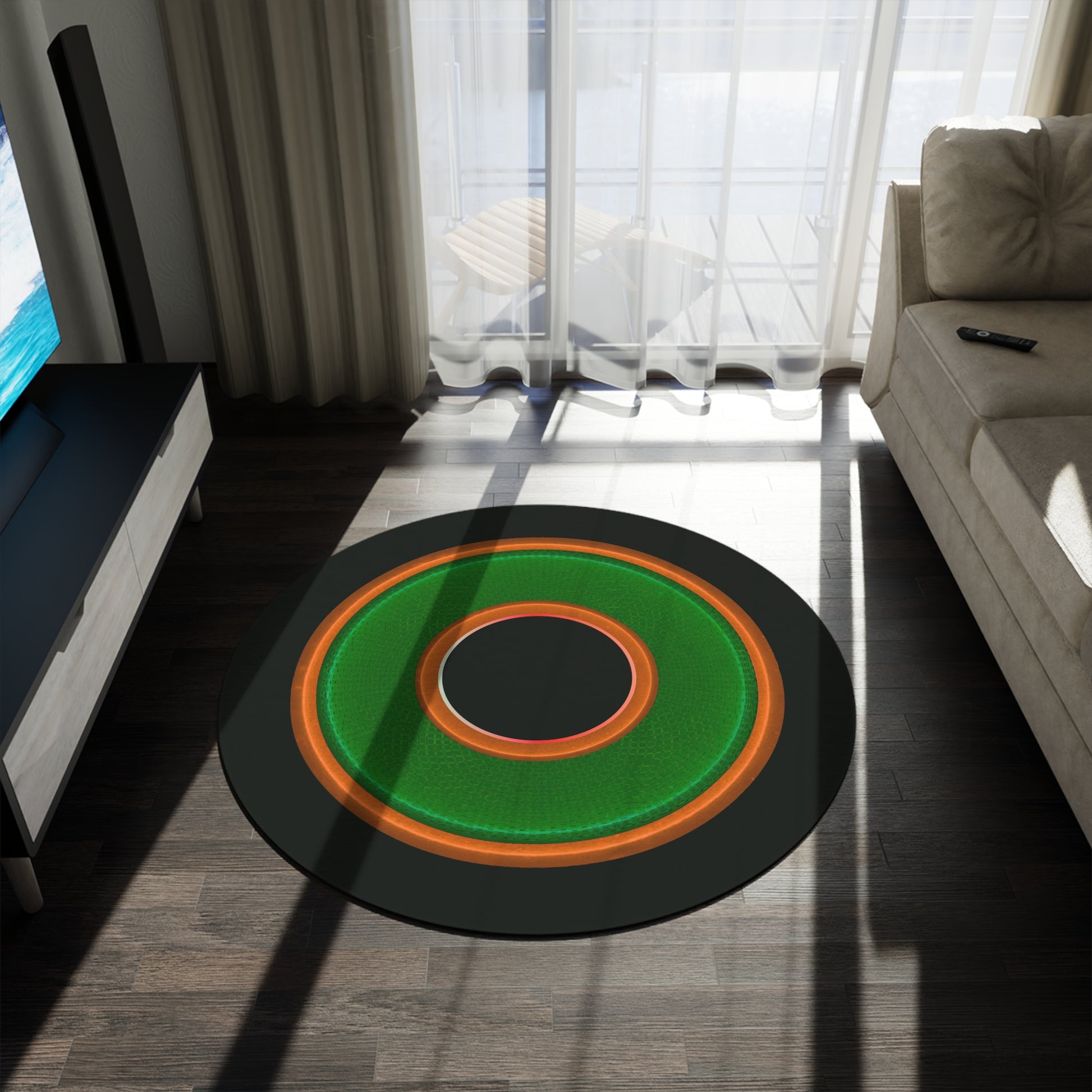 Round Room - 5 ft x 5 ft Lumpy Donut Rug - "Plain Donut" - rustic green/orange donut w/midnight moss green background