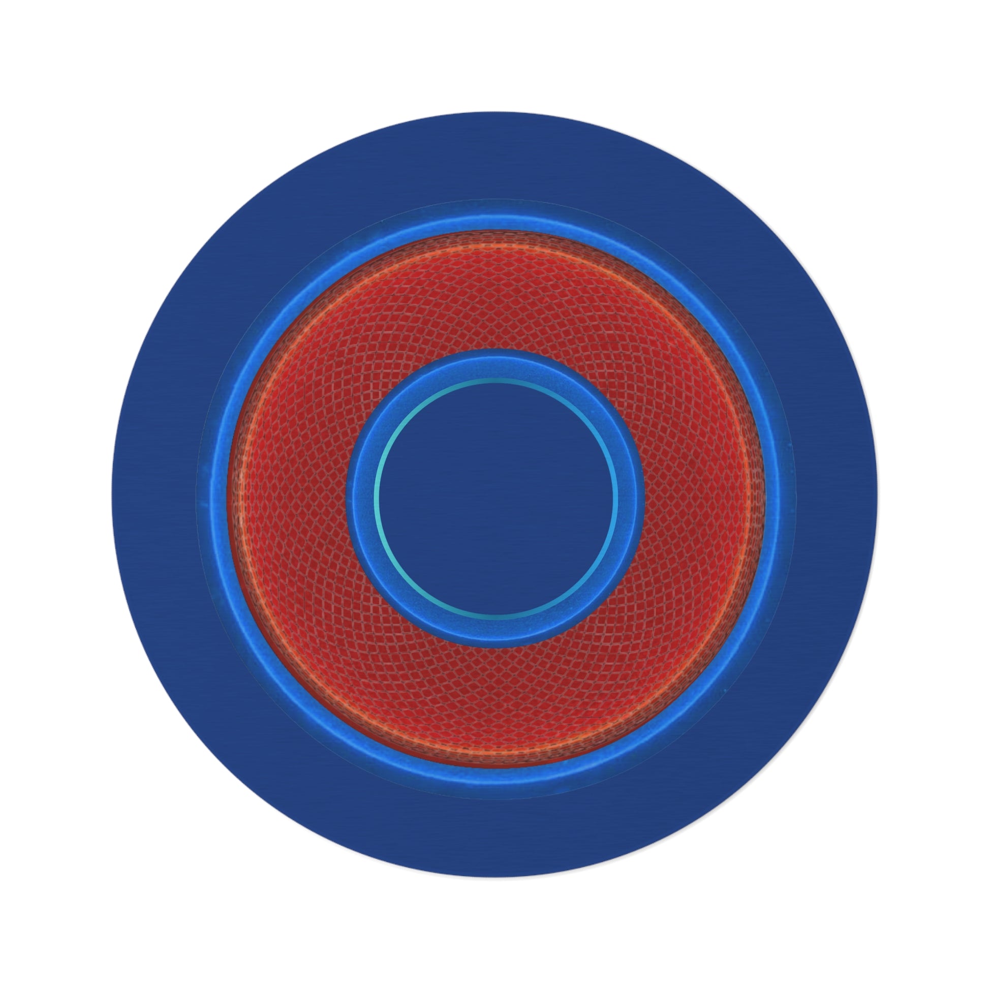 Round Room - 5 ft x 5 ft Lumpy Donut Rug - "Plain Donut" - rustic red/blue donut w/dark blue background