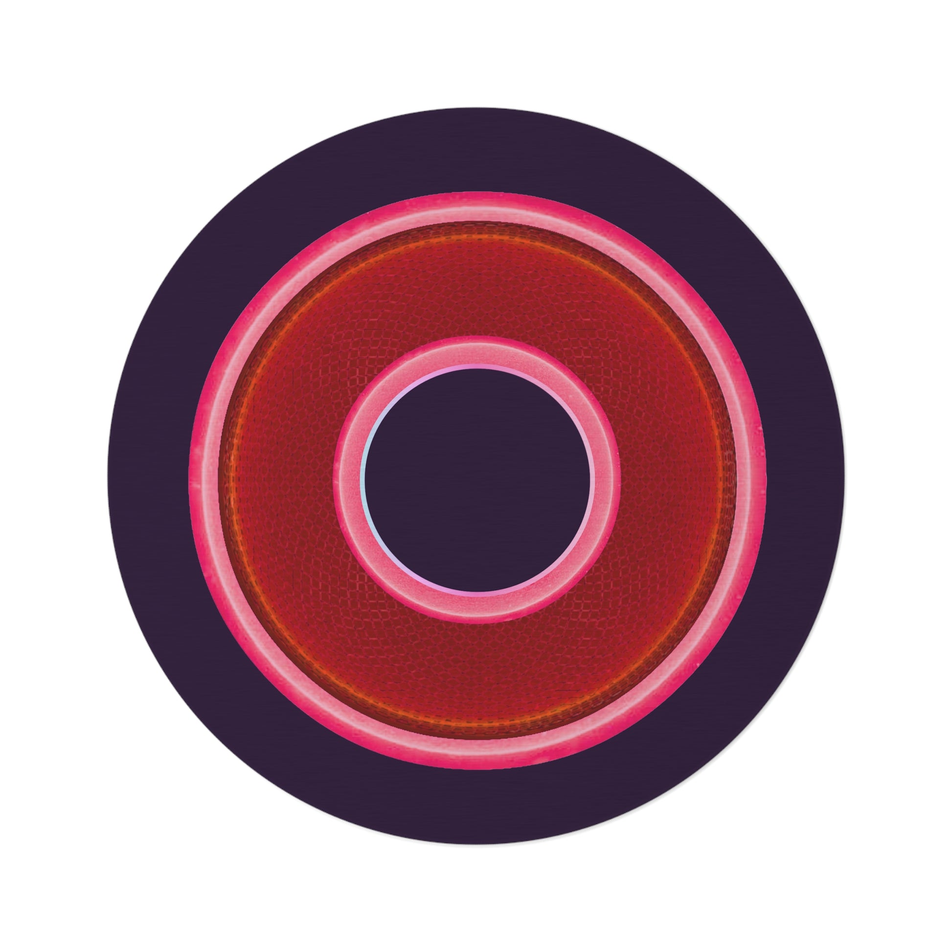 Round Room - 5 ft x 5 ft Lumpy Donut Rug - "Plain Donut" - rustic red/pink donut w/midnight purple background