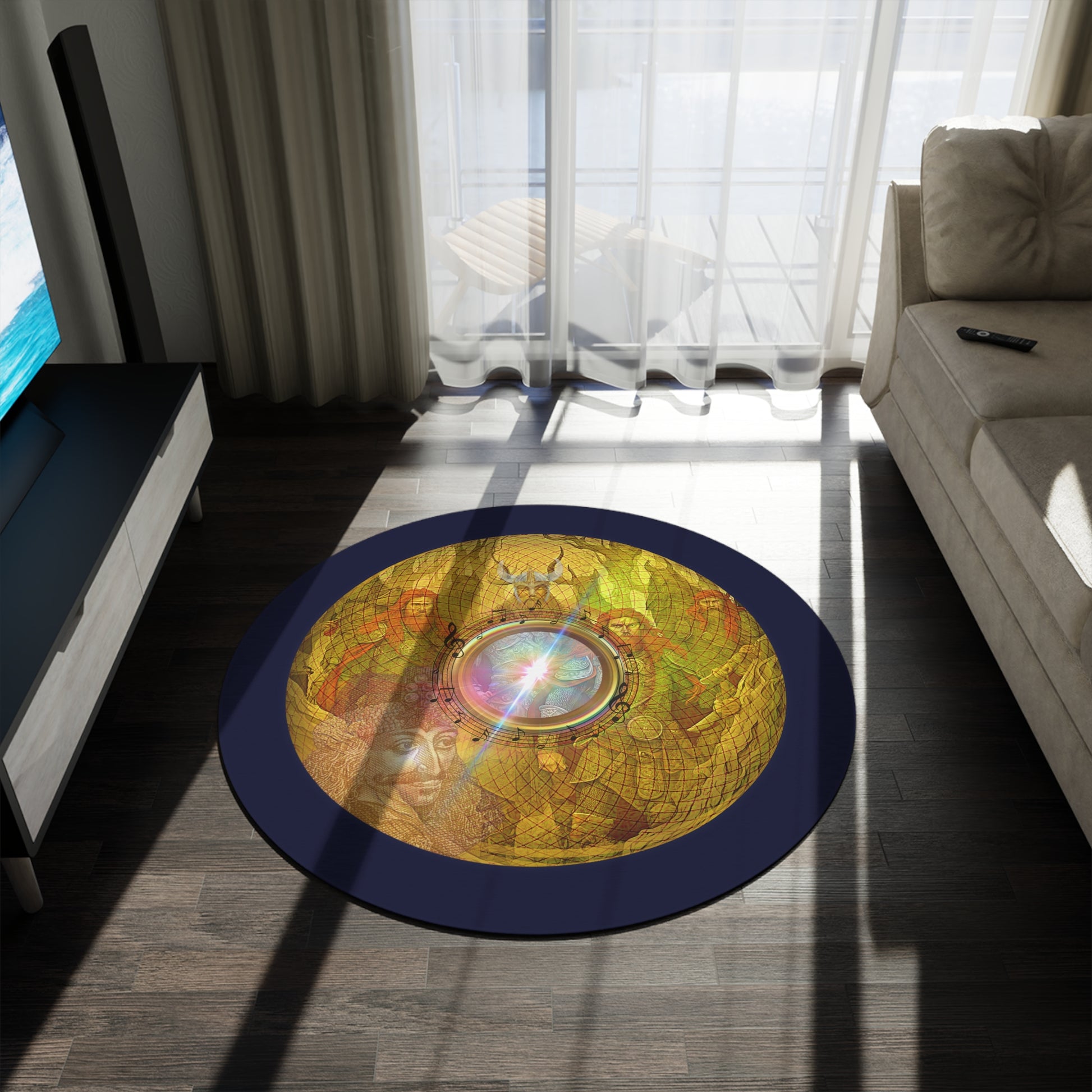 Round Room - 5 ft x 5 ft Lumpy Donut Rug - "The Impaling Donut Rug" - golden symmetrical donut w/dark navy background