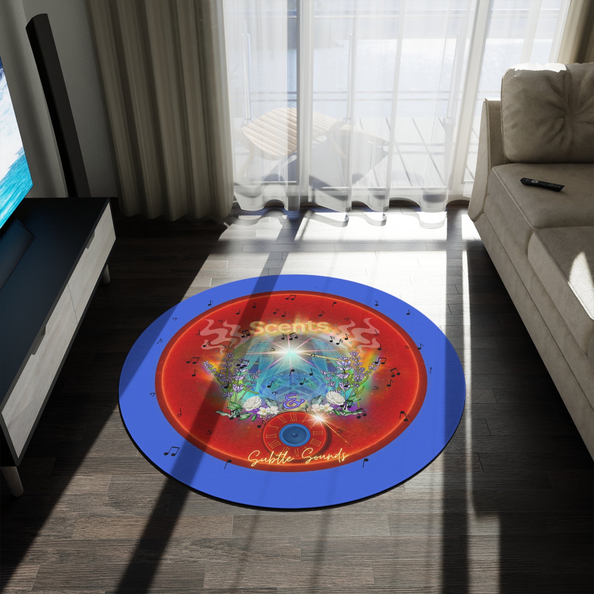 Round Room - 5 ft x 5 ft Lumpy Donut Rug - "The Scented & Subtly Delicious Donut Rug" - vivid red donut w/royal blue background