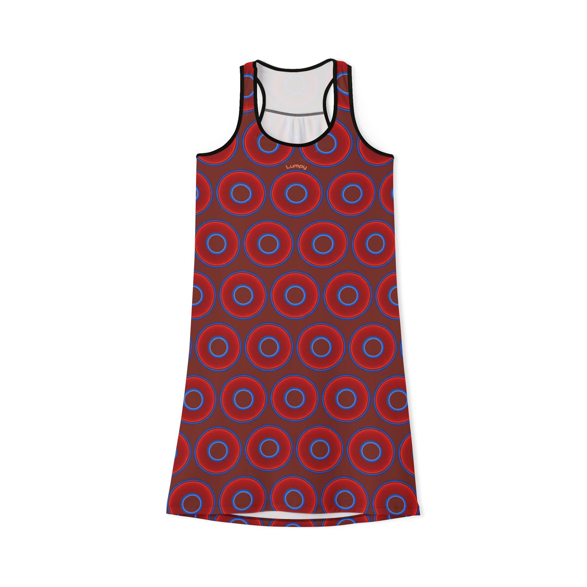 Tela's Lumpy Racerback Donut Dress - red vivid donut print w/burnt umber background