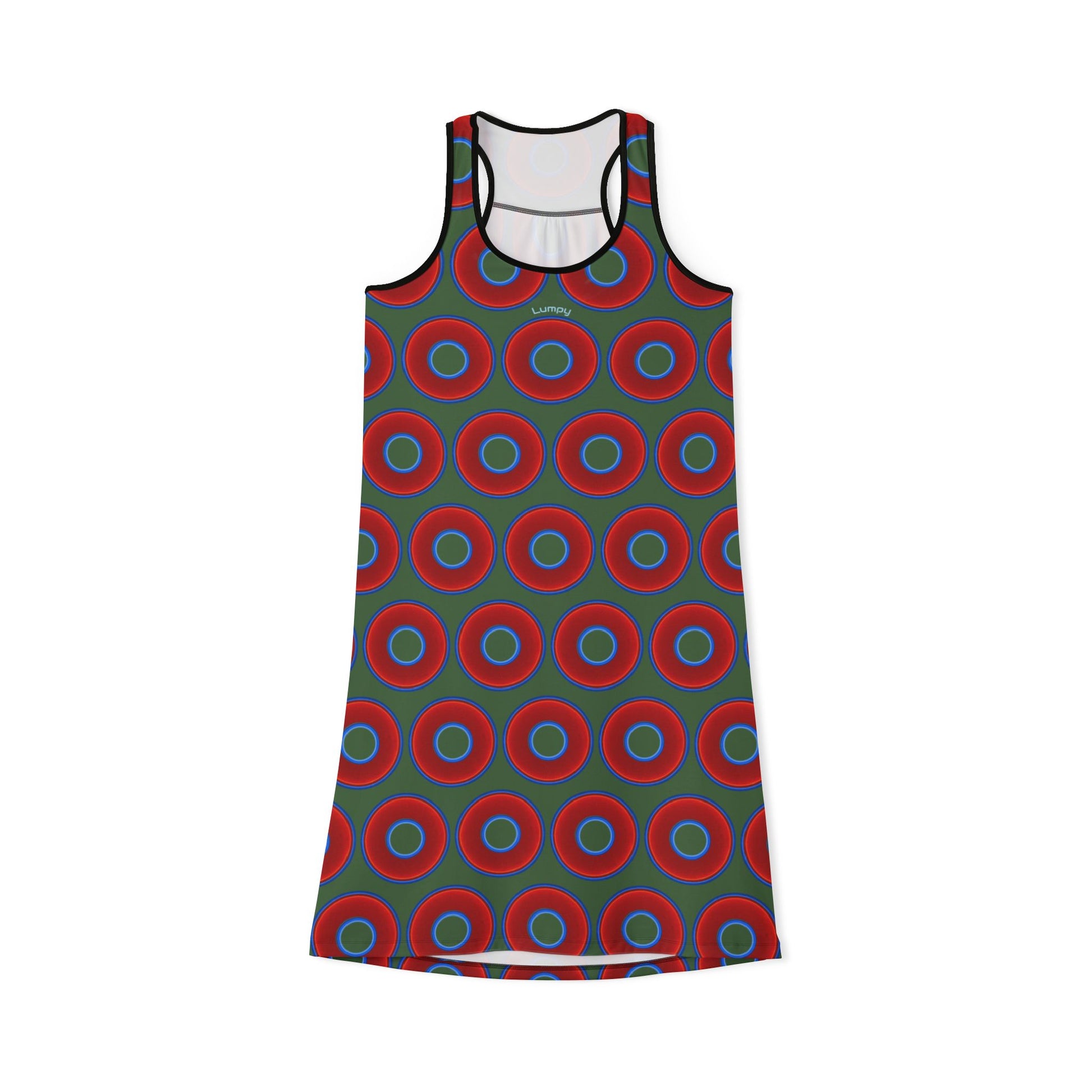 Tela's Lumpy Racerback Donut Dress - red vivid donut print w/dark green background
